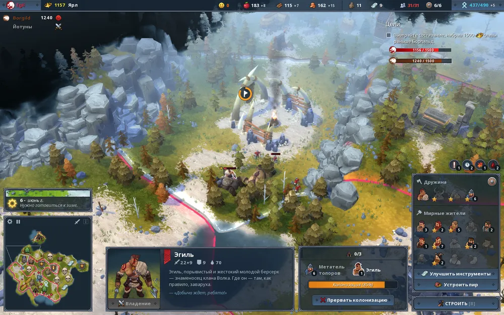 Как только мы откроем и колонизируем зону 5, у нас появится новая цель в главе – возможность разрешения конфликта между группировками йотунов мирным путём. Именно эта цель теперь станет ключевой (не забываем при этом, что заступник йотунов не должен погибнуть). Как только область колонизирована, направляем трёх поселян на изучение этой древней реликвии, а это займёт много времени. Тем временем в зонах 1, 2 и по возможности 3 строим защитные башни, они нам пригодятся. Не лишним будет возвести учебный лагерь в зоне 1 и, например, лагерь метателей топоров в зоне 4. Когда будут поднакоплены с небольшим запасом ресурсы, построим склады в зонах 2 и 3.