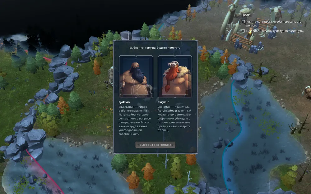 В свою очередь рекомендую выбирать сторону «загнивающих угнетателей», т.е. Скрюмира и вот почему. Скрюмир считается хозяином местных земель, а потому, если мы выберем сторону честных трудяг под предводительством Фьольсвина, то при колонизации новых земель в каждой области помимо традиционных врагов – диких животных, валькирий и тому подобных созданий, нам необходимо будет сражаться с йотуном, защищающим эту область. При выборе стороны Скрюмира вновь осваиваемые территории нам будет легче освоить, а, следовательно, и достичь победы. Каких-либо существенных плюсов, кроме как справедливости, и немного большего запаса припасов по отношению к трудящимся я не усмотрел при выборе противоположный стороны.