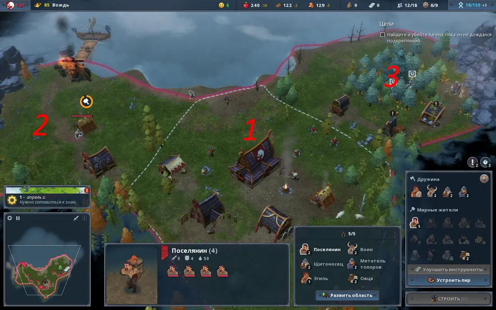 В локации с ратушей (зона 1) строим лагерь разведчиков, дом лесника и дом. Дабы сэкономить время, а оно будет в этой главе играть ключевую роль, обоих разведчиков принудительно отправляем на исследование только нужных нам территорий. В зоне 2 есть озеро, а потому после зачистки территории Сварном и Логом от волков строим хижину рыбака. Сразу же направляемся в зону 3, где расправляемся с драуграми, а после колонизации, если позволяют ресурсы, возводим поля. После восполнения запасов в зоне 2 возводим дом шамана (аналог хижины знахаря) и восстанавливаем уровень здоровья наших воинов.