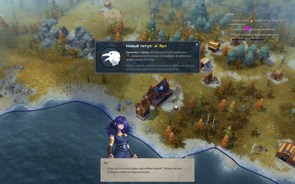 Ранее мы уже встречались с Лив в 4-й главе «Торговая война» и не случайно, особенностью этого клана является торговля, что даёт неплохой прирост золота. Ещё одной особенностью, которая нам будет весьма полезна, является возможность приобретать наёмников для организации набега на нужные нам земли. И наконец, самая важная с моей точки зрения особенность это возможность колонизировать новые территории не только за еду, но и за золото.