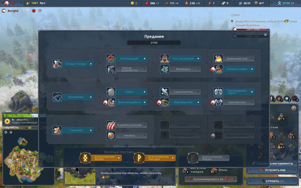 В локации с ратушей (зона 1) строим лагерь разведчиков и дом. Дом лесника пока не строим, его возведём в области 2 с лесом. В каждой из колонизируемых областей есть дикие звери, в зонах 2, 3, 4 и 5 это волки. И если в зонах 2 и 4 наш предводитель Лив сможет от них избавиться, то после этого нам предстоит прервать захват новых земель, обустроить новые земли и накопить ресурсов. В зоне 4 возводим поля, в зоне 1 рынок. К этому времени (сентябрь первого года) поступает первый запрос помощи от Сварна (75 еды), проблем возникнуть не должно – первый срок подготовки заказа не такой короткий, да и источник добычи пищи есть в наличии. Почти сразу становится доступным использование преданий для активации особых навыков. В отличие от предыдущей главы, здесь упор стоит сделать на навыках третьей ветки – «Торговля» и открывать их все по порядку, исключение стоит сделать разве, что для основного навыка первой ветки (открыть его вторым – третьим).