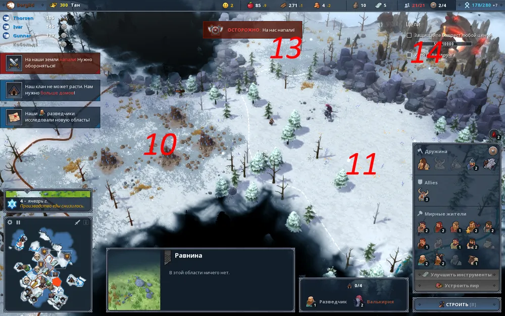 Когда вторая волна оттаявших мертвецов успешно ликвидирована, начинаем готовиться к полномасштабному вторжению. Это подразумевает наличие хорошей по численности дружины, улучшенное оружие, активированных преданий, позволяющих усилить наносимый урон. Стоит ли говорить, но золота вечно не хватает, а потому строим рынок, например, в области 5 и торговый пост, например, в области 8 и заполняем их. Эти мероприятия позволят нам скопить золота и на него обучить достаточное количество дружинников. Поэтому всё оставшееся время зарабатываем золото, а на торговом посту продаём излишки, например, древесины. Как только начнётся пятый год, тратим всё золото на обучение метателей топоров, дружина при этом у нас будет заполнена практически полностью. Если нет свободных поселян, обучаем будущих дружинников из некритичных для существования клана представителей – пивоваров, лесорубов, охотников, торговцев. При нехватке золота можно разрушать построенные здания (кроме защитных башен, хижины знахаря и военных лагерей), что даст немного недостающего золота. Напоследок можно построить ещё одну хижину знахаря для оперативного восстановления наших воинов.