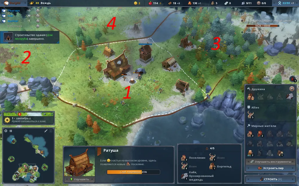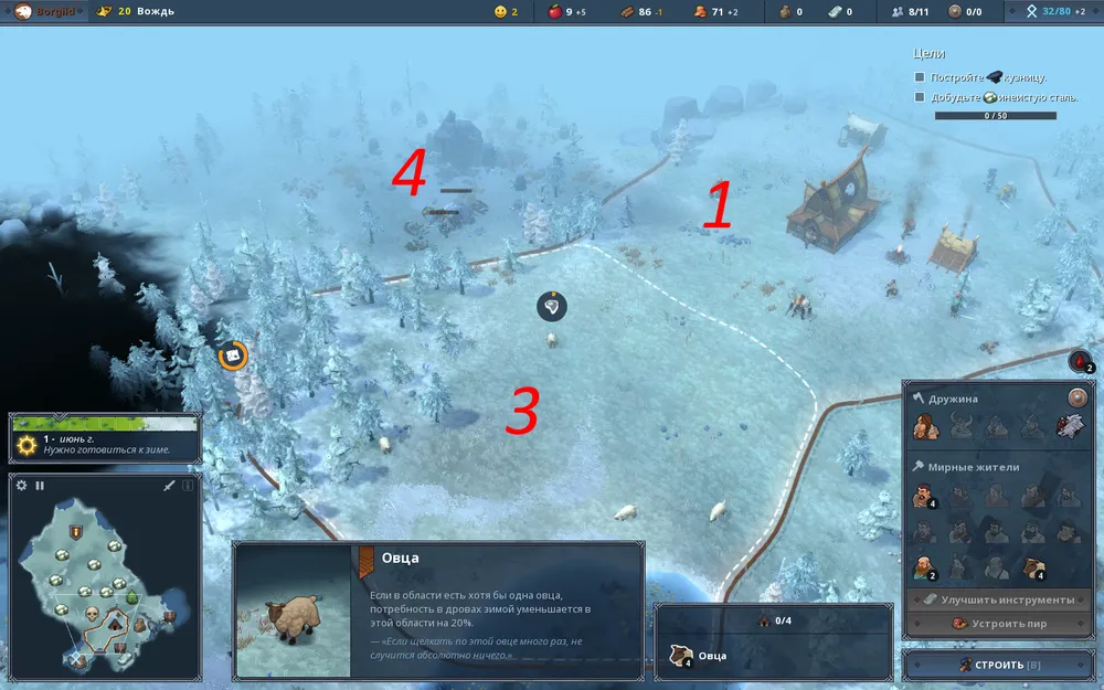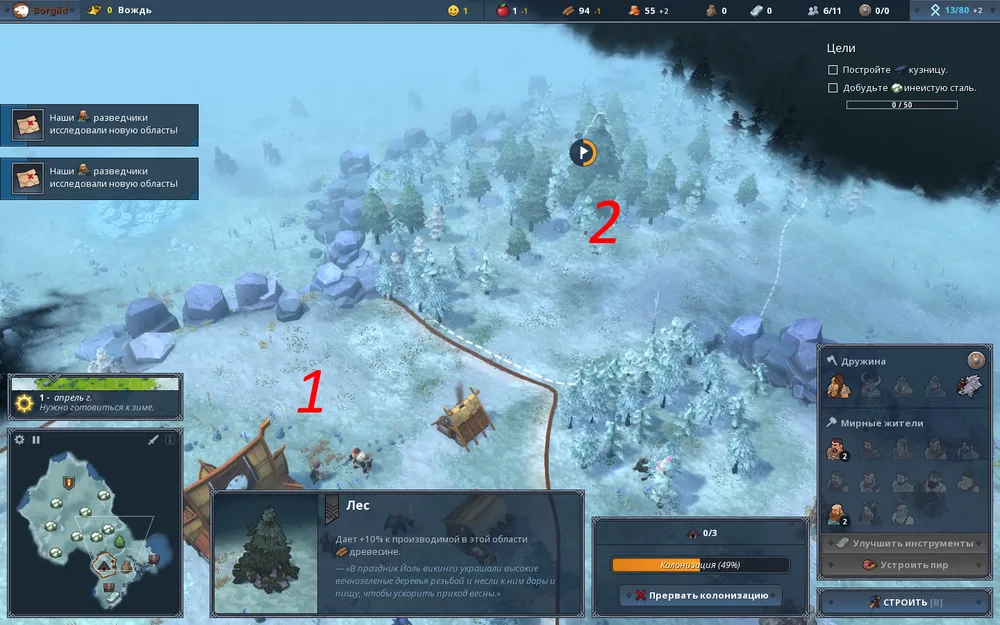 Для начала возводим в зоне 1 с ратушей лагерь разведчиков и дом. Колонизируем область 2 с лесом и строим дом лесоруба. После этого, поскольку в открытых зонах 1 и 2 нет природного источника пищи, ждём, пока поселенцы накопят необходимо для колонизации новой области количество еды. После этого отправляем Боргильд и Кайю в зону 3 для расправы с волками, после чего колонизируем эту область.
