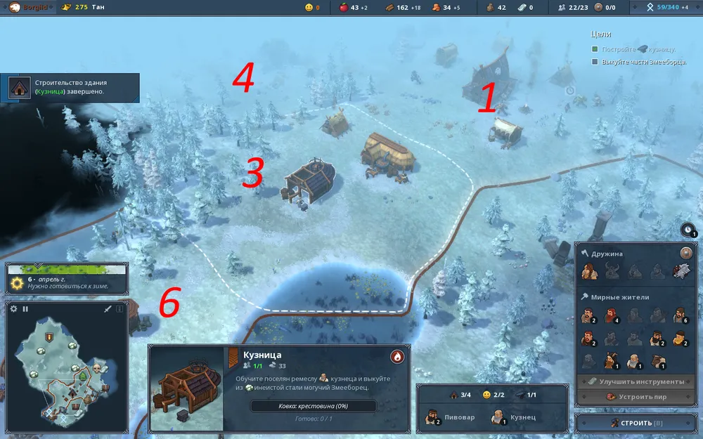 Следующая в очереди на колонизации область 4, в которой водятся волки, после истребления, которых строим здесь хижину рыбака. В зоне 5 богатой лесом избавляемся от медведей и впоследствии, когда её колонизируем, построим ещё один дом лесоруба. К концу первого года стоит возвести в зоне 1 учебный лагерь, поскольку в этой главе нам потребуется немаленьких размеров дружина, а также для повышения обороноспособности нашего последнего рубежа – защитная башня.