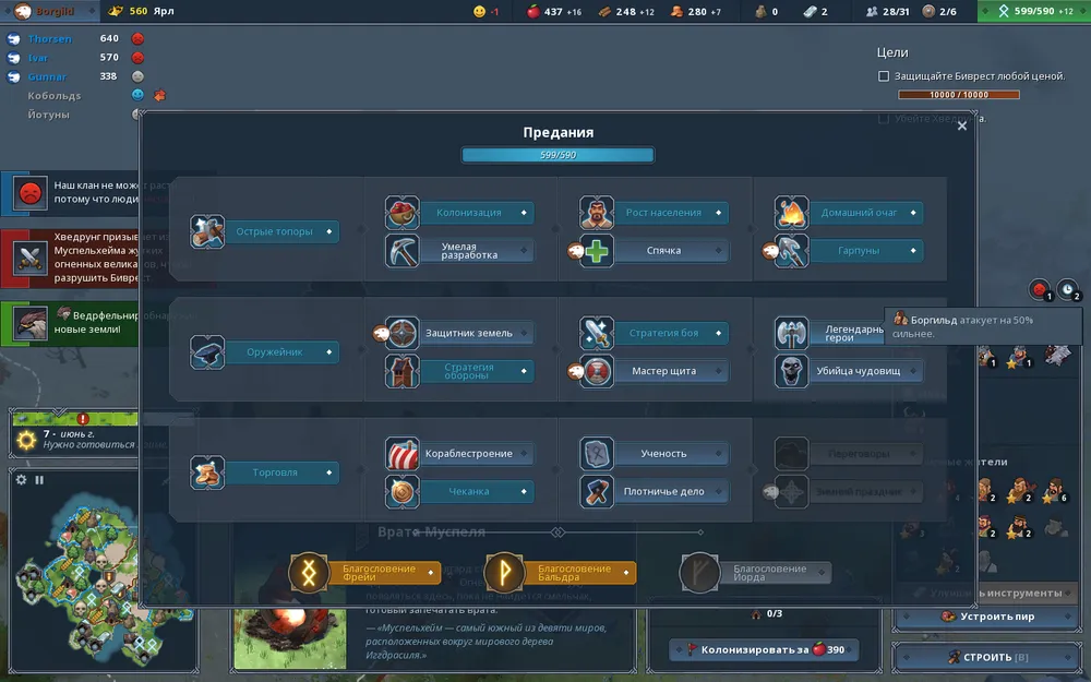 Следующие в очереди на колонизацию области 7 и 8. В 7-й находятся ещё одни врата Муспеля, закрыв которые мы значительно облегчим себе жизнь, а в 8-й место силы «Гнев Тора» благодаря которому наши дружинники будут атаковать немного активнее. Захватив эти области, Боргильд получает титул Тана, а потому её и Кайю, пока не ведётся активных боевых действий, следует направить в зону 4 для повышения производительности еды в этой области. Как только места для проживания заканчиваются в зоне 6 можно построить ещё 1 дом, а чуть позже и второй. Также здесь самое время возвести торговый пост, а в области 7 – рынок. Сделав это, открываем умение «Торговля» для повышения количества зарабатываемого золота. После этого наши предания тратим на развитие максимального количества навыков второй ветки «Оружейник». Также в области 7 можно построить лагерь щитоносцев.