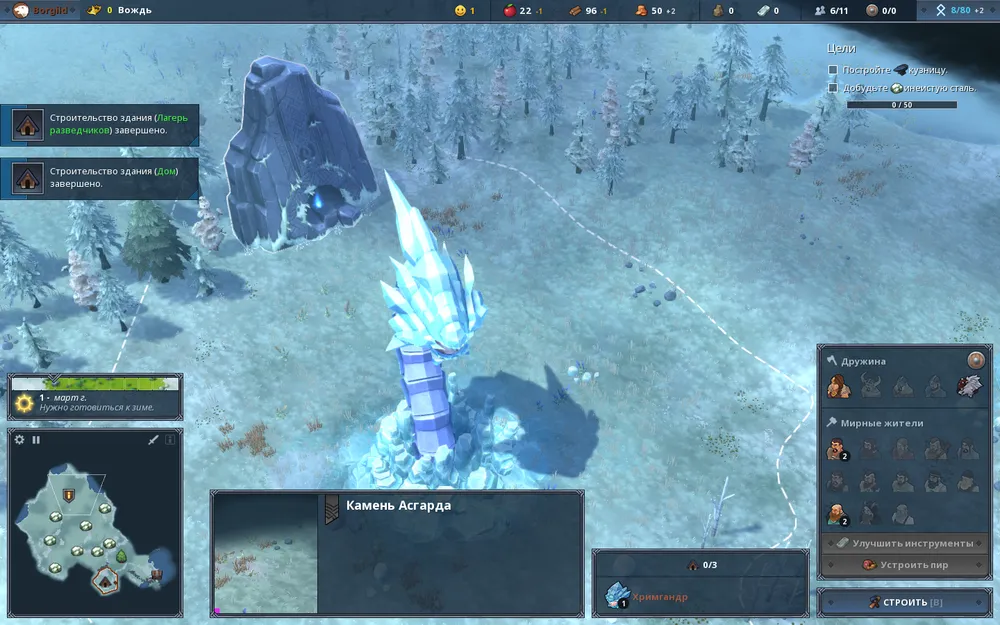 Первым делом строим лагерь разведчиков и дом в первой локации. Далее осваиваем после очистки от волков зону 2 с лесом и строим здесь дом лесоруба. Очищаем снова от волков зону 3 с ареалом обитания оленей, колонизируем её и строим сторожку охотника, а также отправляем одного поселенца для добычи преданий. Теперь, когда у нас есть источники поступления основных ресурсов, и мы накопили небольшой их запас, можно задуматься о дальнейших улучшениях. Для этого строим в зоне 2 дом, чтобы было, куда расти населению, а в зоне 1 возводим хижину знахаря и восстанавливаем здоровье наших воинов. Как только накопится достаточное количество преданий, начинаем открывать умения первой ветки «Острые топоры», затем «Колонизация», чтобы меньше тратить на освоение новых областей.