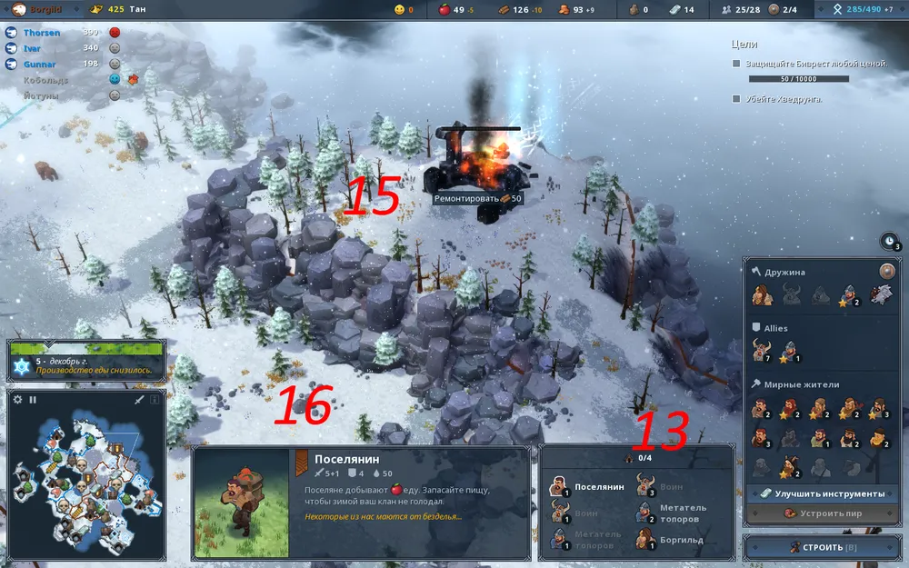 После того как мы избавились от последней «великанской» угрозы, приступаем к накоплению ресурсов. В зоне 10 возводим каменоломню и начинаем добычу железа. В зоне 4 можно добыть камня для улучшения зданий, либо приобрести его на рынке. Добытый камень пускаем на улучшение ратуши, затем дома, после оставляем для улучшения защитных башен. Железо пускаем на улучшение сначала оружия наших основных дружинников, в моём случае – метателей топоров, а после, поскольку железа много, улучшаем инструменты всех категорий мирного населения, начиная с добытчиков еды и древесины.