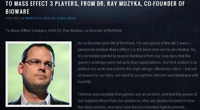 И когда, казалось, от суждений и наобродного гнева стало совсем некуда деться, BioWare совершила неожиданный ход. На ее сайте появилось открытое письмо от самого Рэя Музыки (одного из основателей студии).