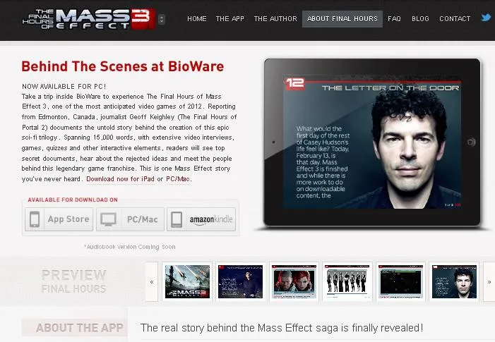 Журналист Джеф Кейли выпустил приложение, The Final Hours of Mass Effect 3 в котором содержались закулисные подробности о разработке игры и интервью с сотрудниками студии. Среди прочего там выяснились две любопытные подробности. Первая из них разочаровала всех, кто решил, что Кейси Хадсон обещает новый финал: в раннем интервью он говорил, что все события во всех DLC к игре будут разворачиваться до или в то же время, что и ее основной сюжет, то есть запланированное дополнение к Mass Effect 3 никак не может быть еще одним вариантом развязки.