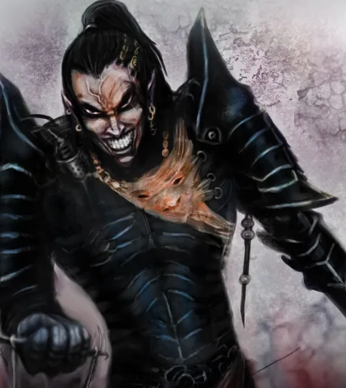 В своей роскошной украшенной ложе перед зрителями подавший знак эльдар, архон Кипселон, наклонился к Яе, лежавшей рядом с ним и выставлявшей змеевидные мускулы своего длинного стройного тела напоказ. Вождь Культа Ярости и наиболее ценный союзник Кипселона , Яе казалась столь же грозной, сколь и ее репутация, ее темные волосы были завязаны серебряной цепочкой, а взгляд ее стеклянных изумрудных глаз мог принудить любого низшего эльдар к повиновению.