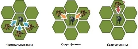 В игре «Меч и Магия: Герои Онлайн» вы сможете наносить больше повреждений войскам противника, если будете атаковать их с флангов или со спины. Это возможно было бы реализовать, используя квадраты, но было бы намного сложнее визуально отследить место, куда должен атаковать ваш юнит и где находиться, и это было бы не так очевидно. Вместе с ударами с флангов и со спины гексагоны привносят в игру больше стратегических возможностей. Важно не только то, где ваши войска могут атаковать противника, но также то, где будет атаковать ваш противник. Вам нужно будет всегда помнить о том, где и в каком положении относительно противника останется ваш отряд в конце раунда, а также всегда учитывать все возможные действия, которые сможет совершить ваш противник в будущем.