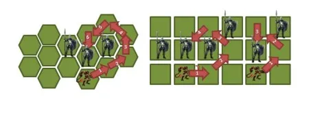 Независимо от того, используются ли квадраты или гексагоны, все хотят иметь возможность двигаться на любое соседнее поле. При использовании квадратов, ходя по диагонали, вы не пересекаете явную границу между клетками. В случае же с гексагонами у вас всегда будет четкая граница между двумя клетками, и намного удобнее планировать маршрут отряда и передвигаться по полю боя.