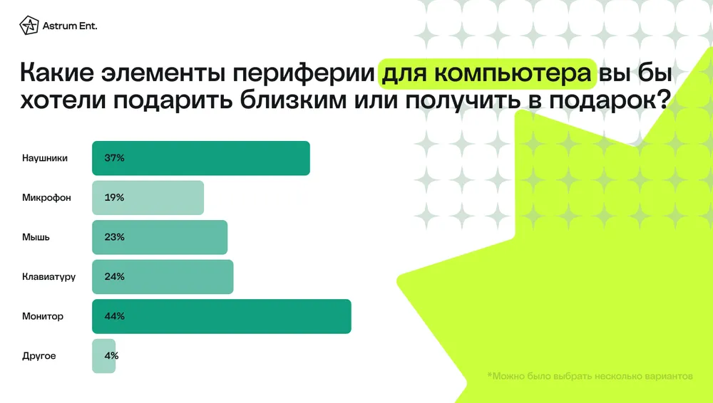 Если выбирать подарок в сфере электроники, то самыми безошибочными вариантами станут наушники или монитор - их очень ждут в качестве подарка или сами готовы подарить близким 44% и 37% геймеров соответственно. Еще 24% будет очень рады клавиатуре, 23% - компьютерной мыши, и 19% - микрофону.