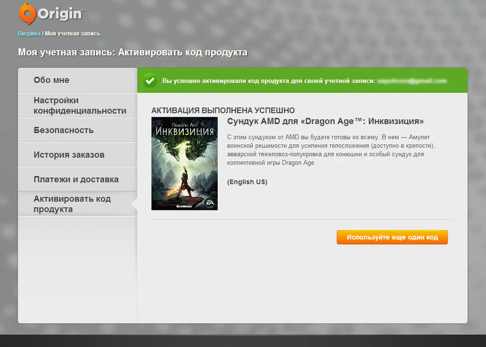 • Далее заходим в "Origin -> Активировать код продукта" и вводим наш ключик. При успешной активации вы увидете это: