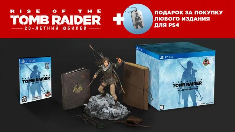 В состав коллекционного издания игры Rise of the Tomb Raider: 20-летний юбилей войдет эксклюзивная коллекционная коробка, 30-сантиметровая фигурка Лары Крофт, точная копия её нефритового ожерелья, журнал главной героини в кожаной обложке, альбом иллюстраций и полная версия игры со всеми дополнениями.