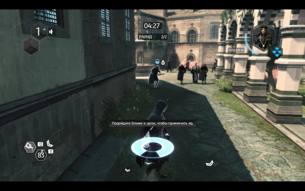 Учтите, однако, что способность очень сильно подсвечивается - применение способности на виду у охотника ничем вам не поможет. Кроме того, маскировка не мешает компасу и не делает вас невидимым - если вы на крыше, один на улице или ведете себя очень подозрительно, вас все равно вычислят.