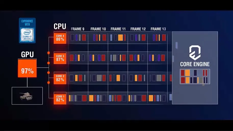 Тщательно проанализировав статистику, разработчики поняли: пришло время реализовать в World of Tanks важную технологическую возможность — полноценную поддержку многопоточной отрисовки, разработанную в сотрудничестве с компанией Intel. Но, чтобы это сделать, нам нужно было «научить» движок выполнять расчёты не поочерёдно, а одновременно на всех доступных ядрах.