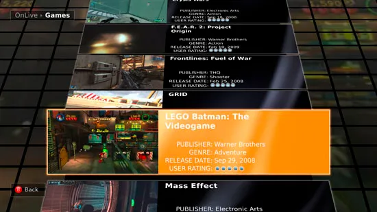 В конечном счете, авторы добились впечатляющих результатов. Они уверяют, что сегодня на одном сервере OnLive может одновременно запускаться порядка десяти игр уровня Lego Batman. Правда, с Crysis такой номер не проходит - прожорливый шутер требует всей мощи GPU. При этом, во время игровой сессии создается сразу два потока видеосигнала: один для самого пользователя, другой для зрителей. При желании, вы можете разрешить другим людям (если они проходят возрастной ценз - есть и такое условие) наблюдать за вашими подвигами в виртуальном мире. Но даже если зрителей нет, видео все равно записывается - очень удобно для киберспортсменов, чтобы проводить "разбор полетов".