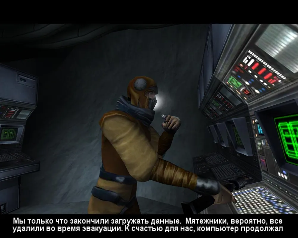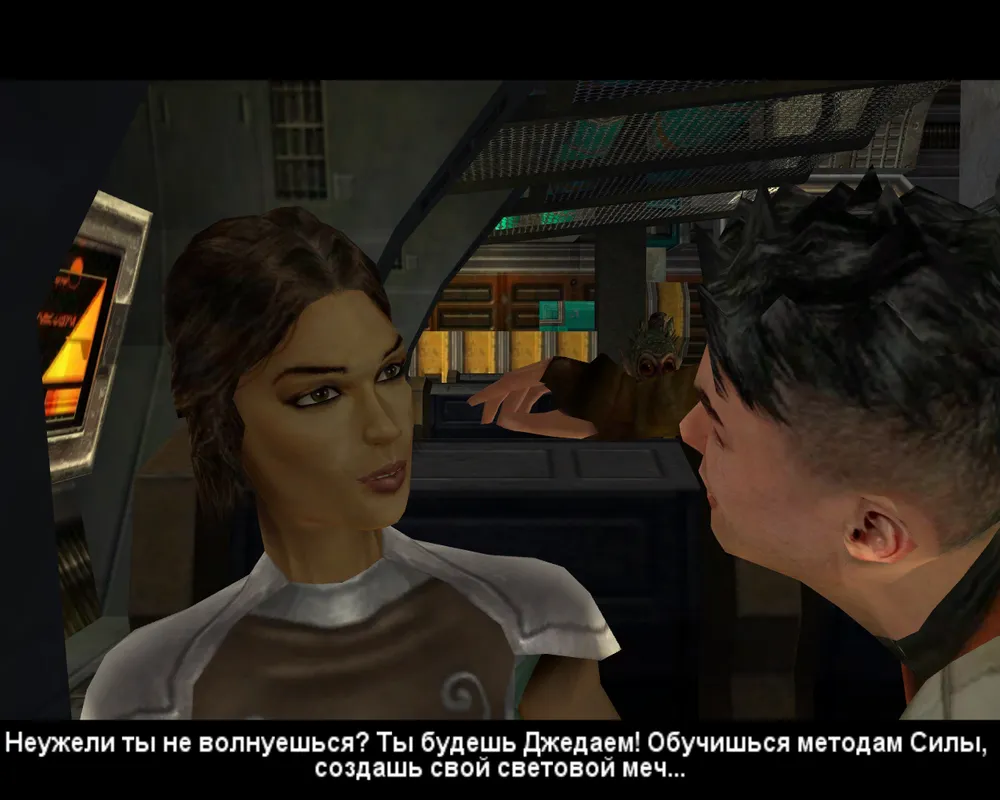 Наконец мы попадаем в игру. Вернее пока еще не в саму игру, а во вступительные титры. Сразу после вступительных титров в стиле Звездных Войн мы оказываемся на корабле, летящем на Явин 4, в академию Джедаев Люка Скайуокера. С нами на борту находятся такие же чувствительные к Силе, как и мы. Один из них, Рош Пенин, даже попытается завести разговор, хоть и в весьма странной форме.