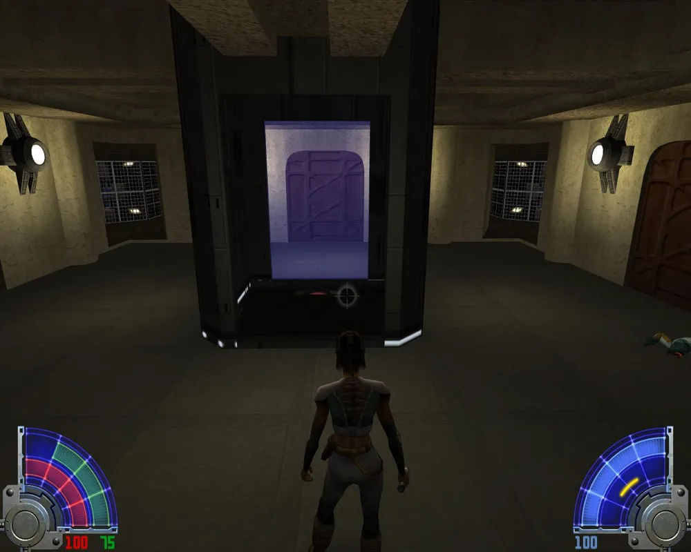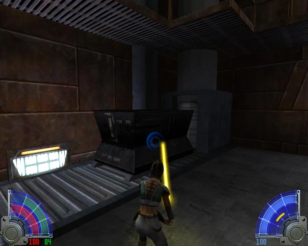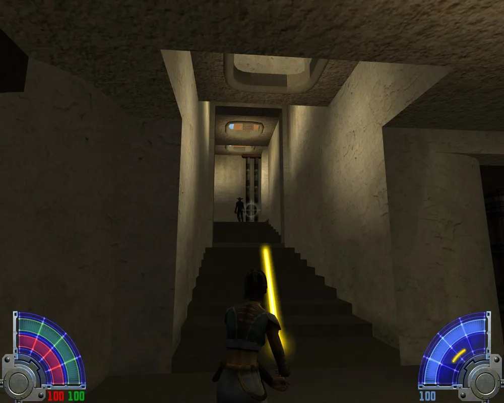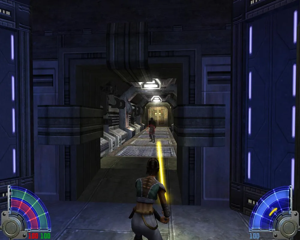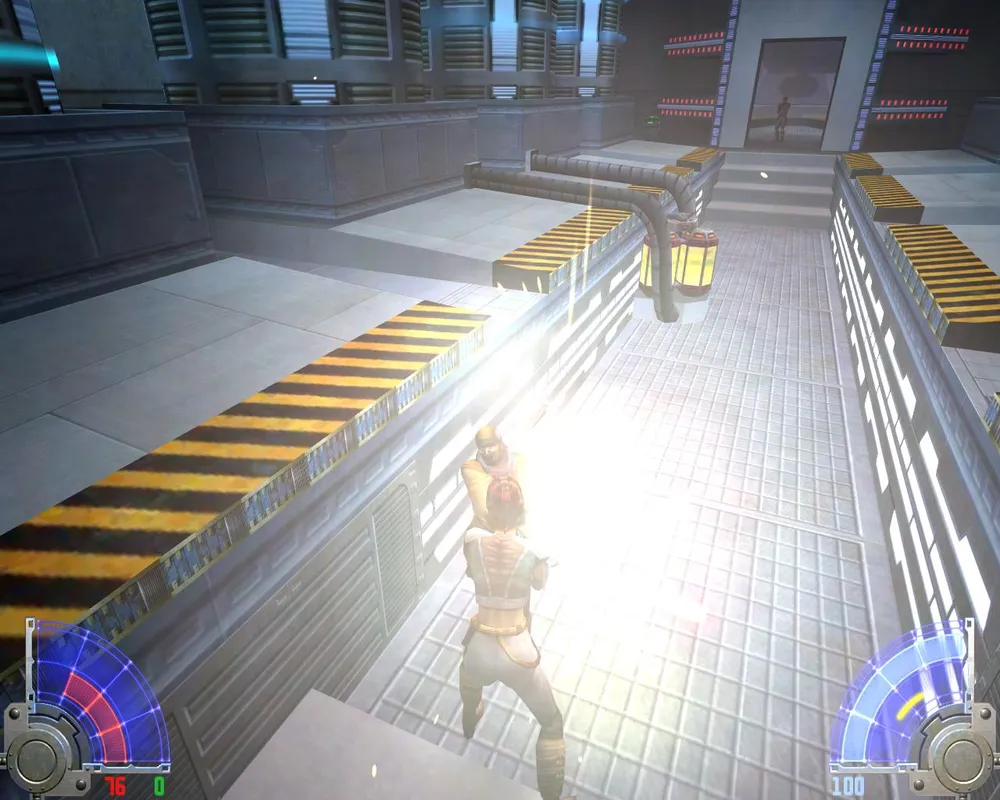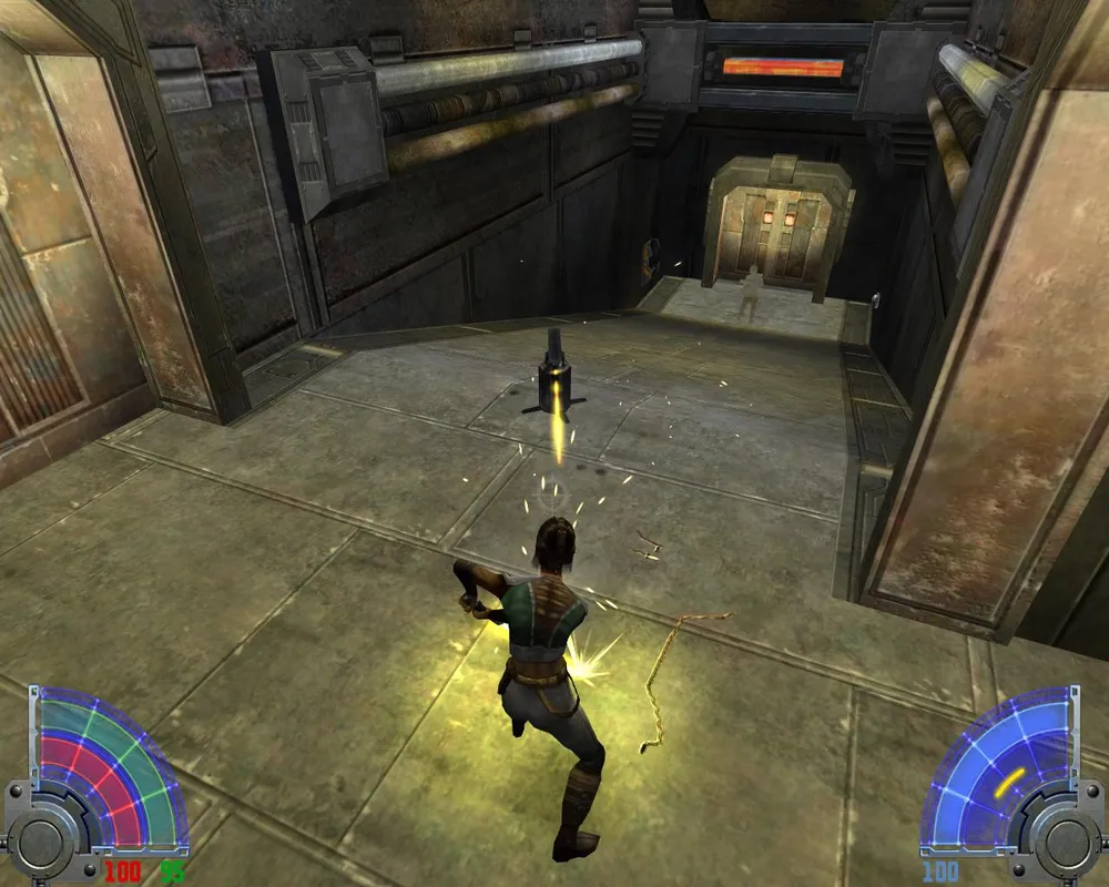Чуть дальше по коридору мы наткнемся на турель. В коридоре мы представляем для нее легкую мишень, но можно ее опередить - добежать до нее раньше, чем она развернется. Бежим дальше по коридорам и комнатам, потом поднимаемся на лифте и двигаемся дальше, убивая десятки штурмовиков. Заблудиться тут негде. Спустившись на лифте и пройдя небольшой коридор, мы натыкаемся на Темного Джедая, разговаривающего с некой Алорой.