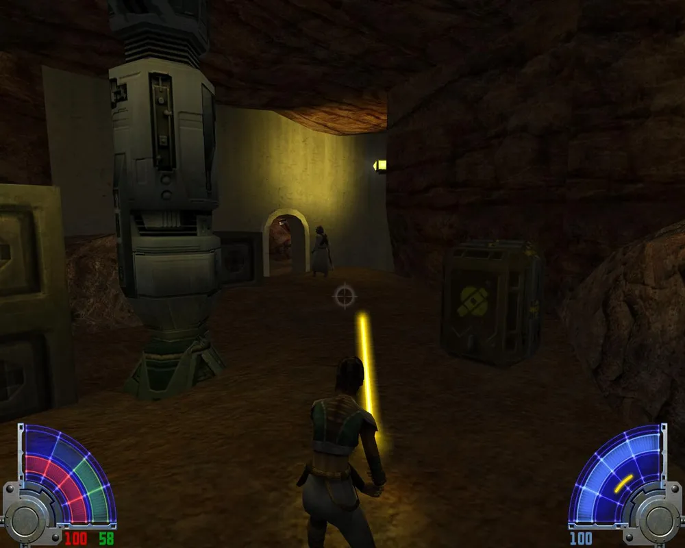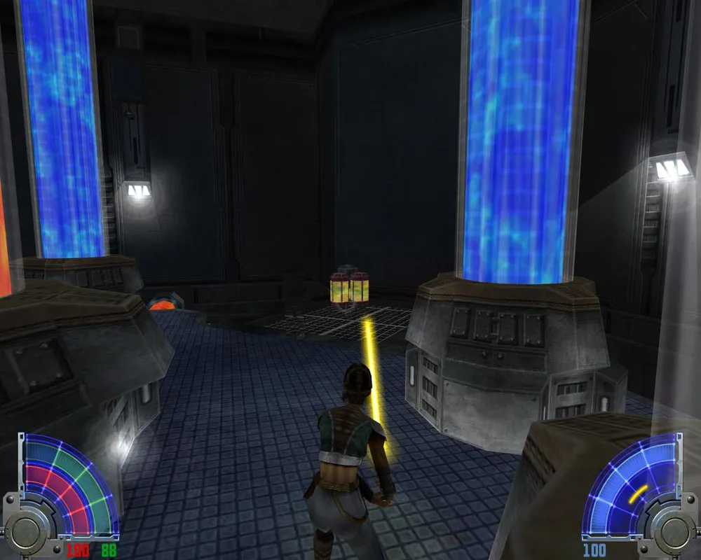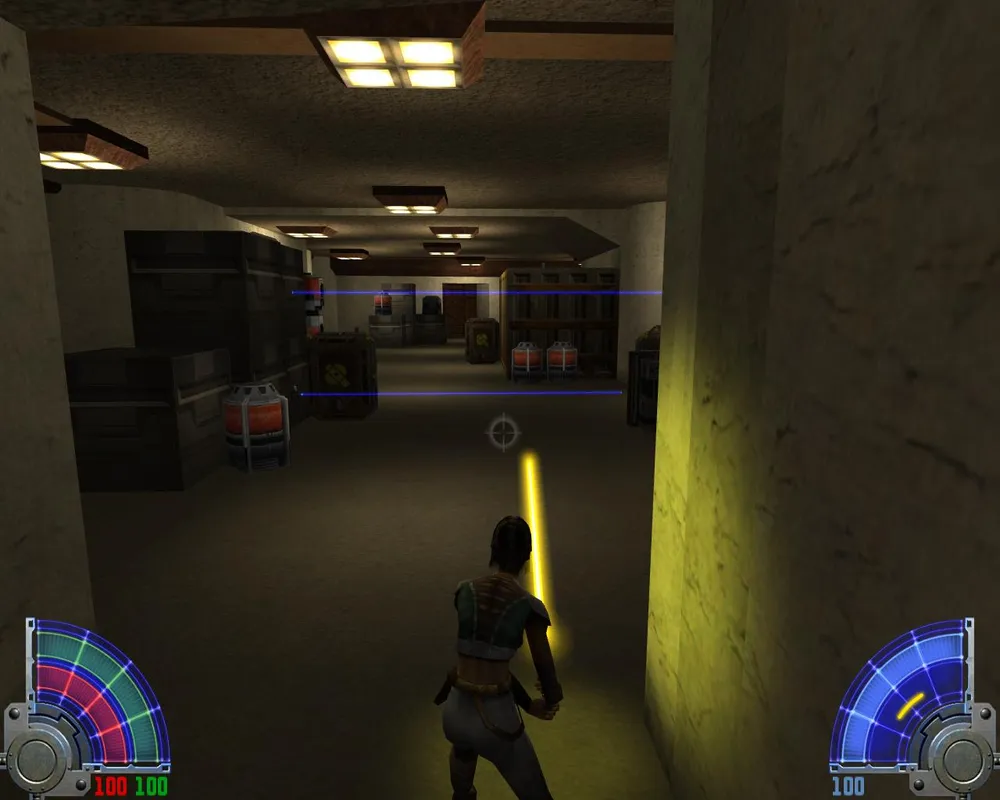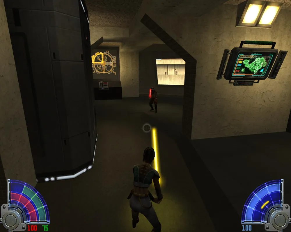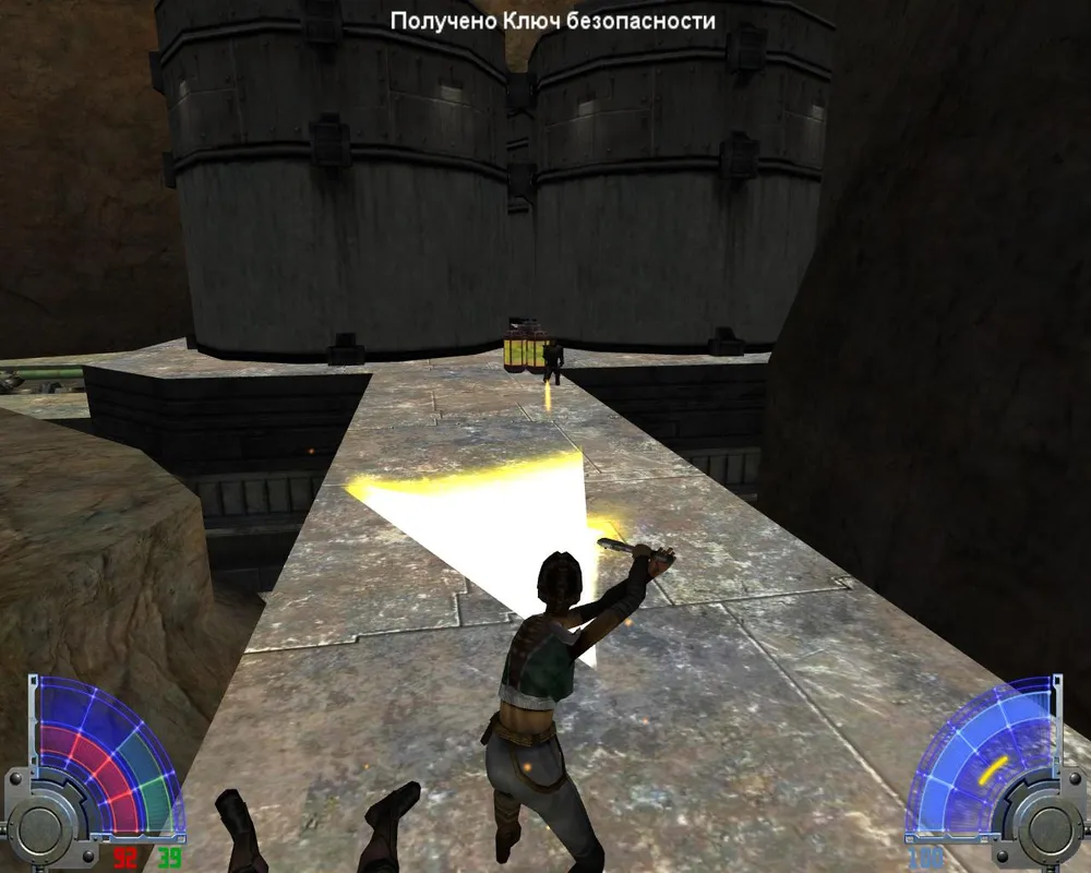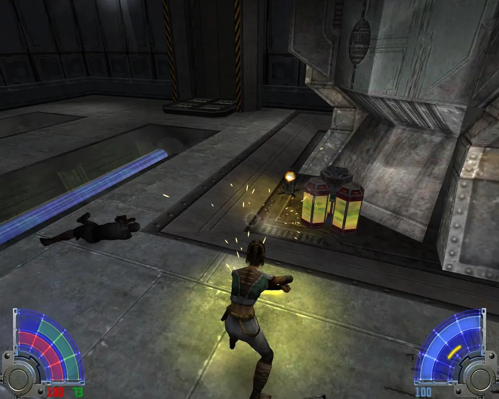 Чуть дальше по коридору мы наткнемся на турель. В коридоре мы представляем для нее легкую мишень, но можно ее опередить - добежать до нее раньше, чем она развернется. Бежим дальше по коридорам и комнатам, потом поднимаемся на лифте и двигаемся дальше, убивая десятки штурмовиков. Заблудиться тут негде. Спустившись на лифте и пройдя небольшой коридор, мы натыкаемся на Темного Джедая, разговаривающего с некой Алорой.