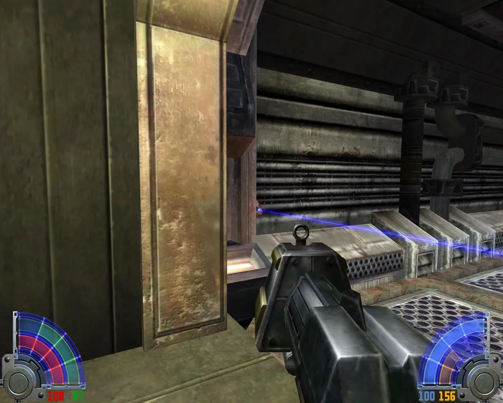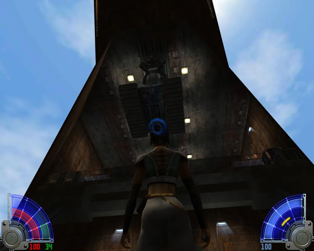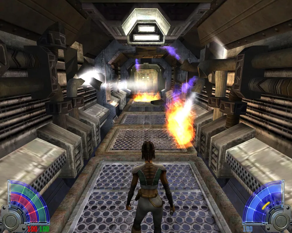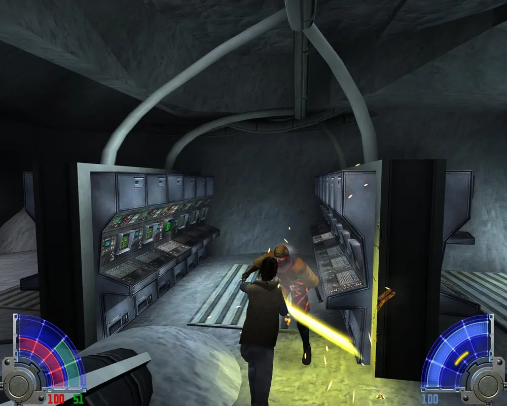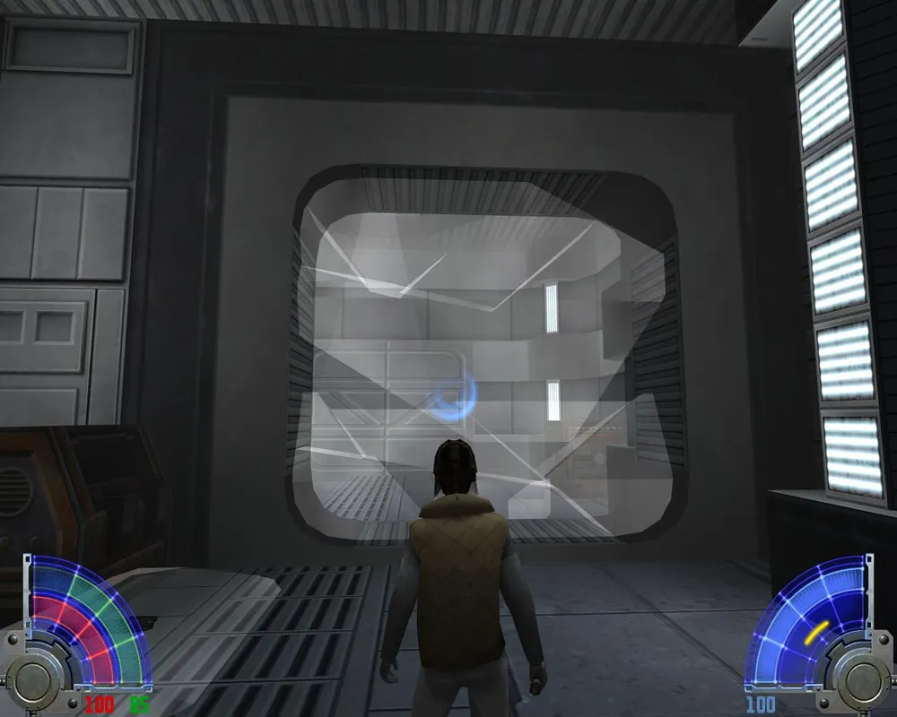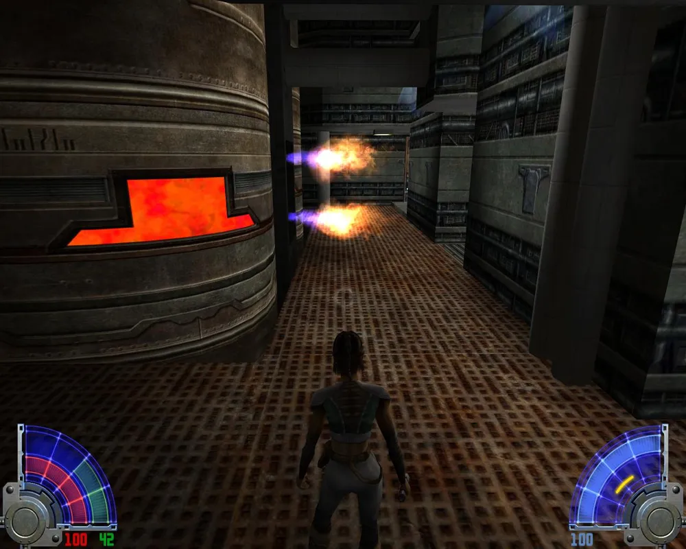Чуть дальше по коридору мы наткнемся на турель. В коридоре мы представляем для нее легкую мишень, но можно ее опередить - добежать до нее раньше, чем она развернется. Бежим дальше по коридорам и комнатам, потом поднимаемся на лифте и двигаемся дальше, убивая десятки штурмовиков. Заблудиться тут негде. Спустившись на лифте и пройдя небольшой коридор, мы натыкаемся на Темного Джедая, разговаривающего с некой Алорой.
