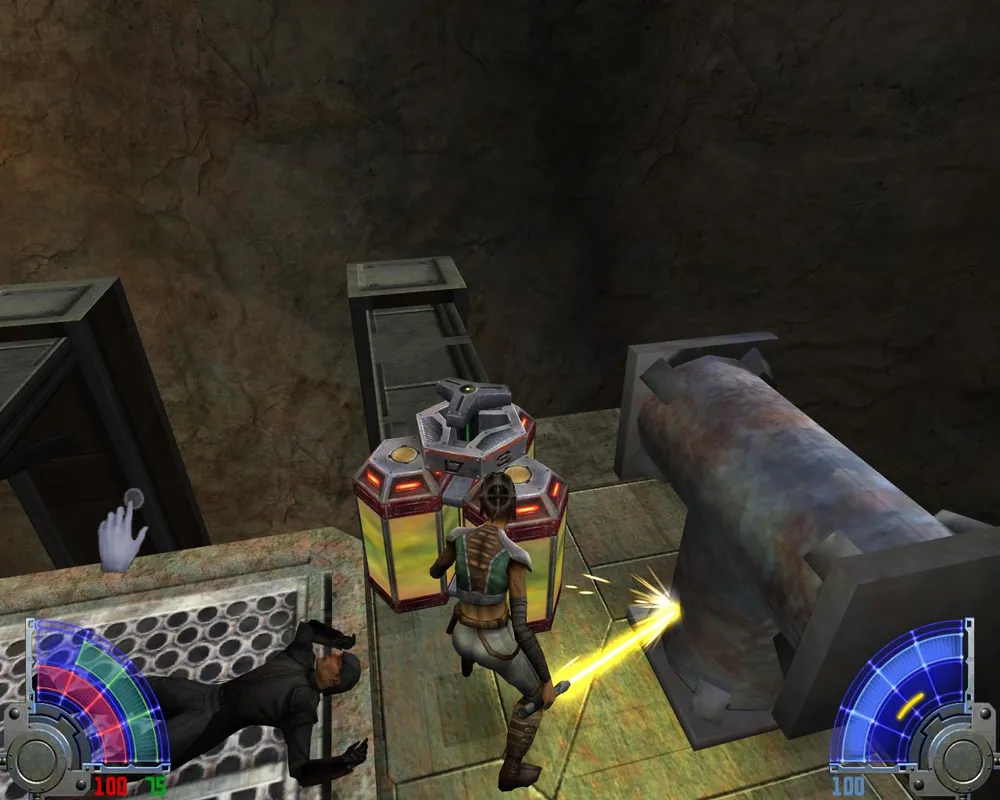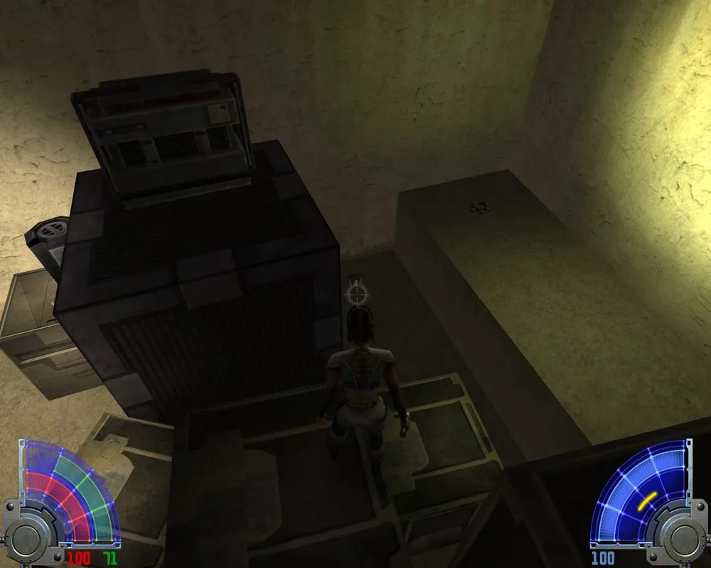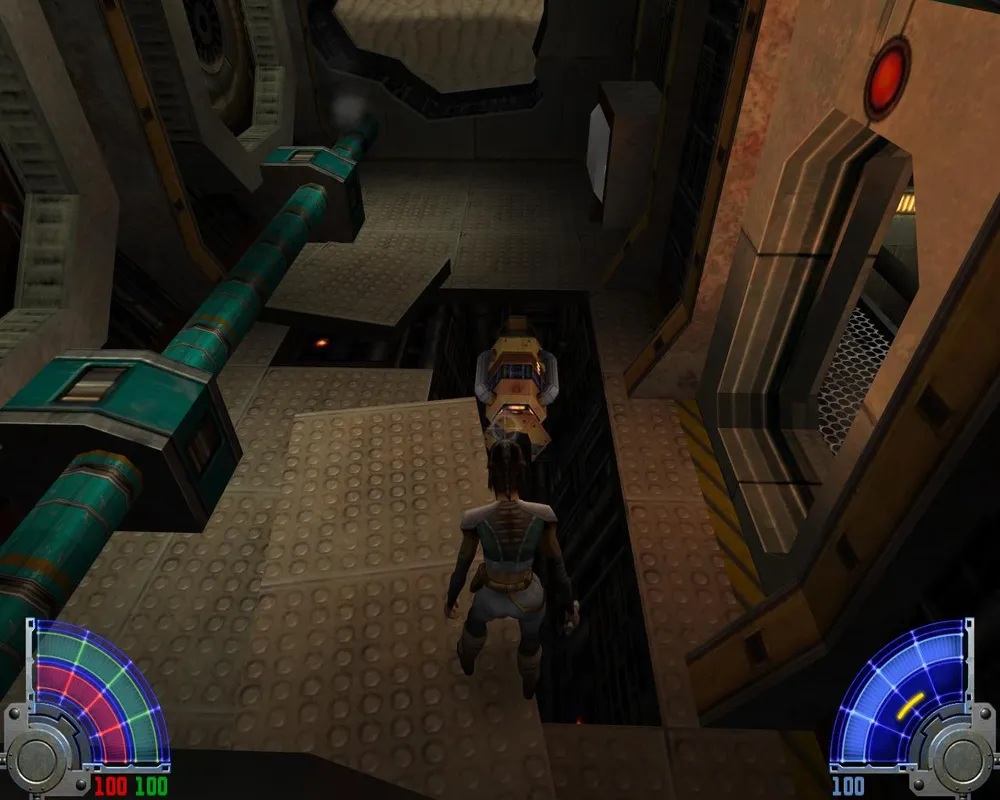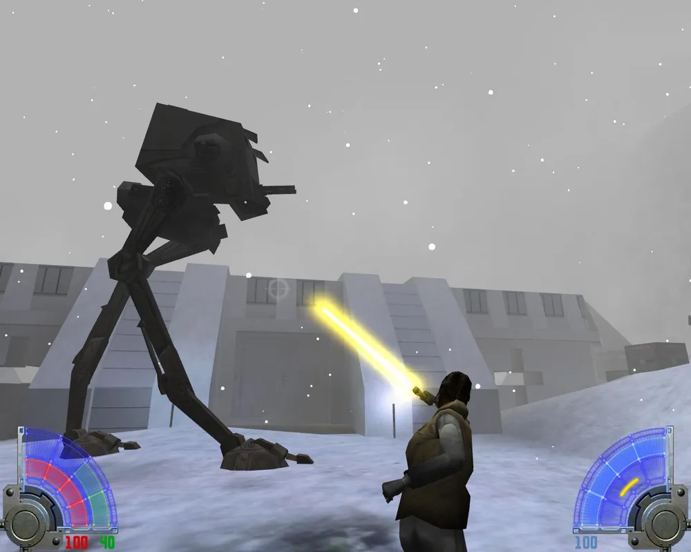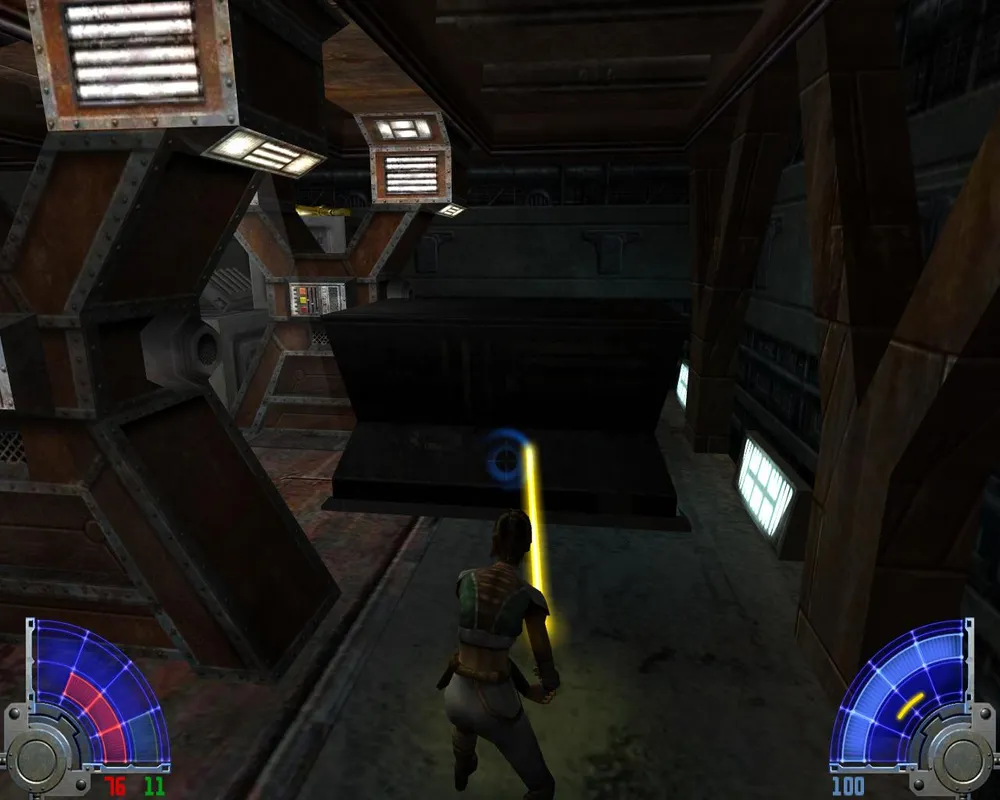 Пройдя чуть дальше, натыкаемся на AT-ST шагающий имперский танк. Чтобы не погибнуть перелезаем через стену. За ней находятся несколько врагов, и какое-то помещение с двумя лифтами. Сначала поднимаемся наверх - там нам надо дернуть рубильник. Так же там есть секретная область. Найти ее можно, если разбить стекло с помощью силы.