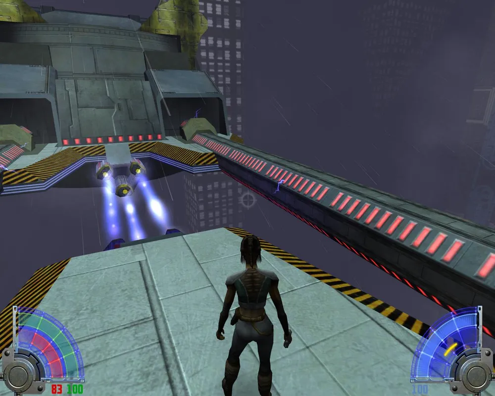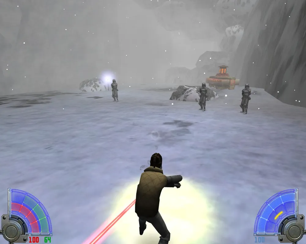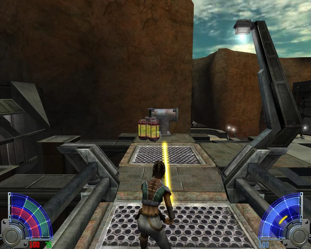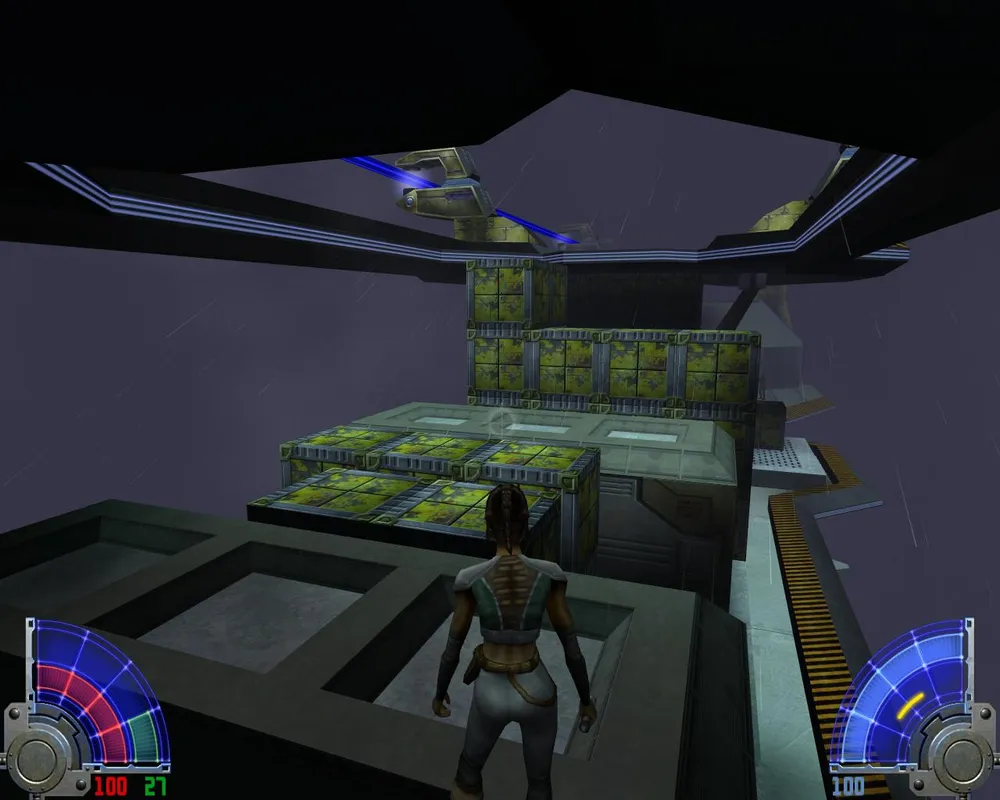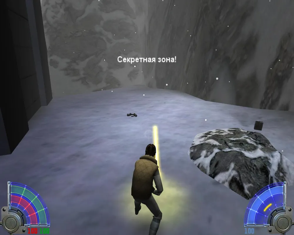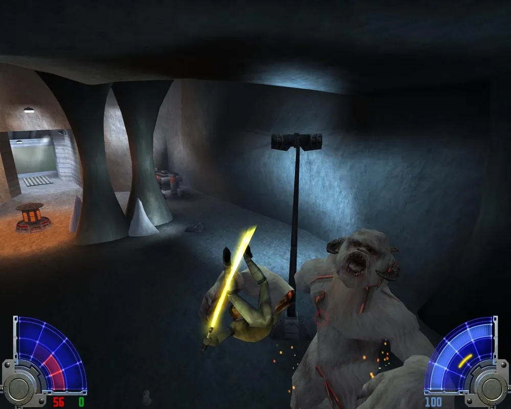 Пройдя чуть дальше, натыкаемся на AT-ST шагающий имперский танк. Чтобы не погибнуть перелезаем через стену. За ней находятся несколько врагов, и какое-то помещение с двумя лифтами. Сначала поднимаемся наверх - там нам надо дернуть рубильник. Так же там есть секретная область. Найти ее можно, если разбить стекло с помощью силы.