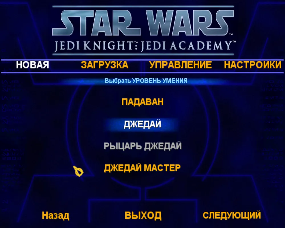 Прежде всего, мы оказываемся в меню, где нам предлагают выбрать сложность. Первые три из предложенных сложностей мало чем отличаются, а вот последняя – «Джедай-мастер» - действительно сложная. В свое время мне довелось пройти игру на этой сложности, и я не хочу снова надрываться, посему мой выбор останавливается на сложности «Джедай», которую предлагают по умолчанию.