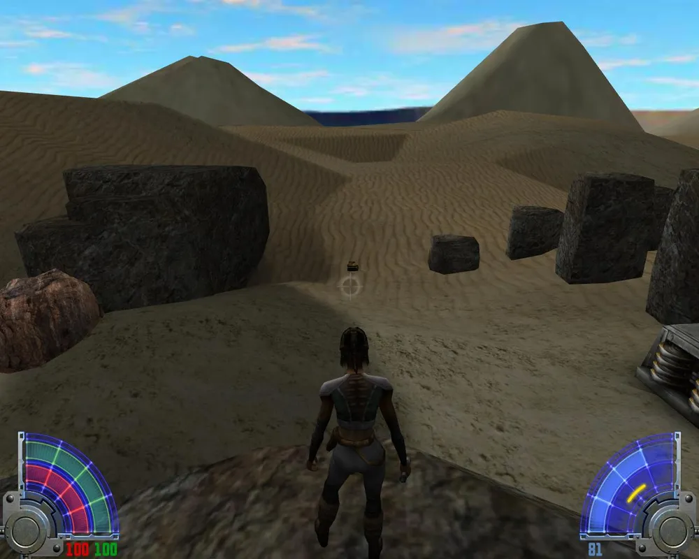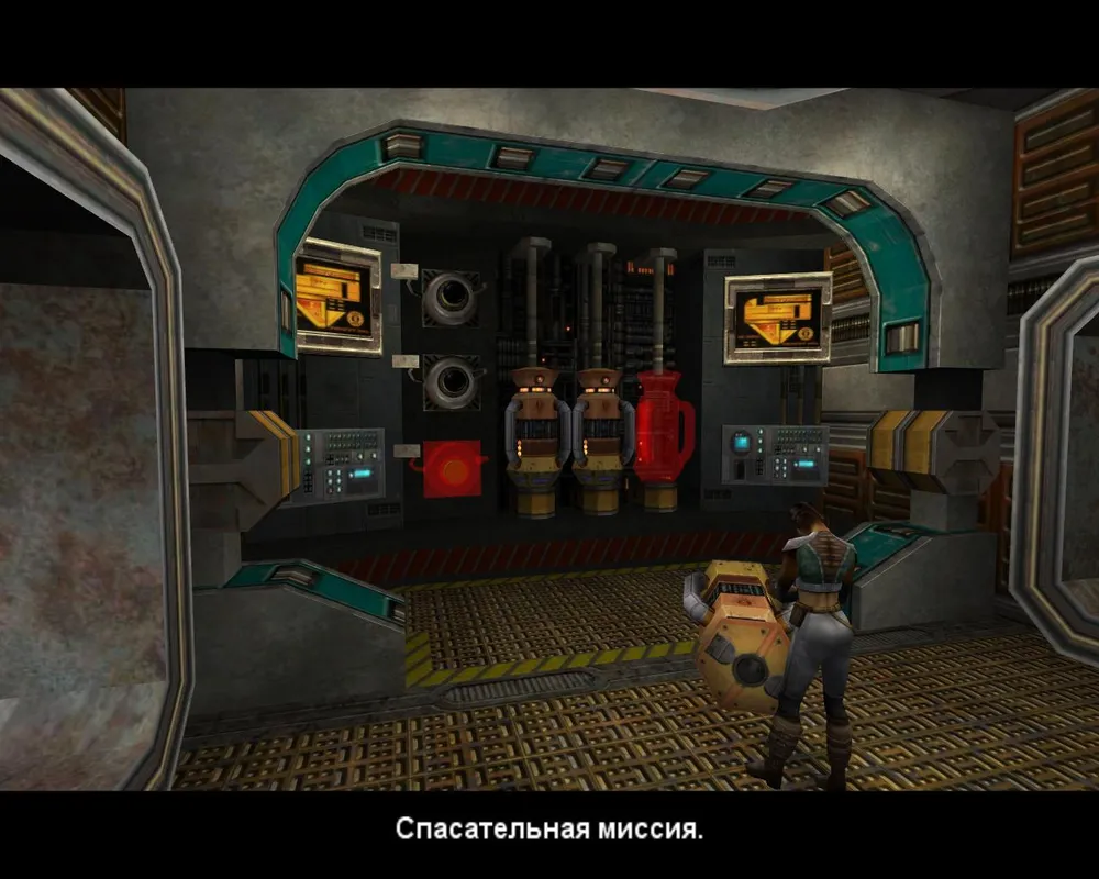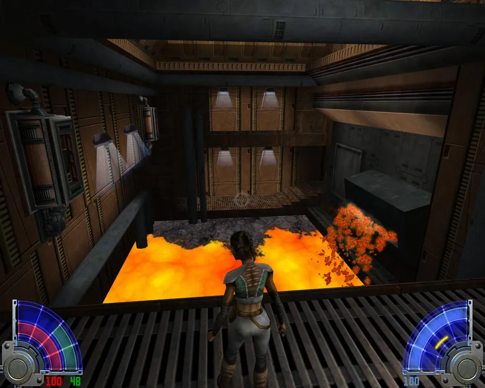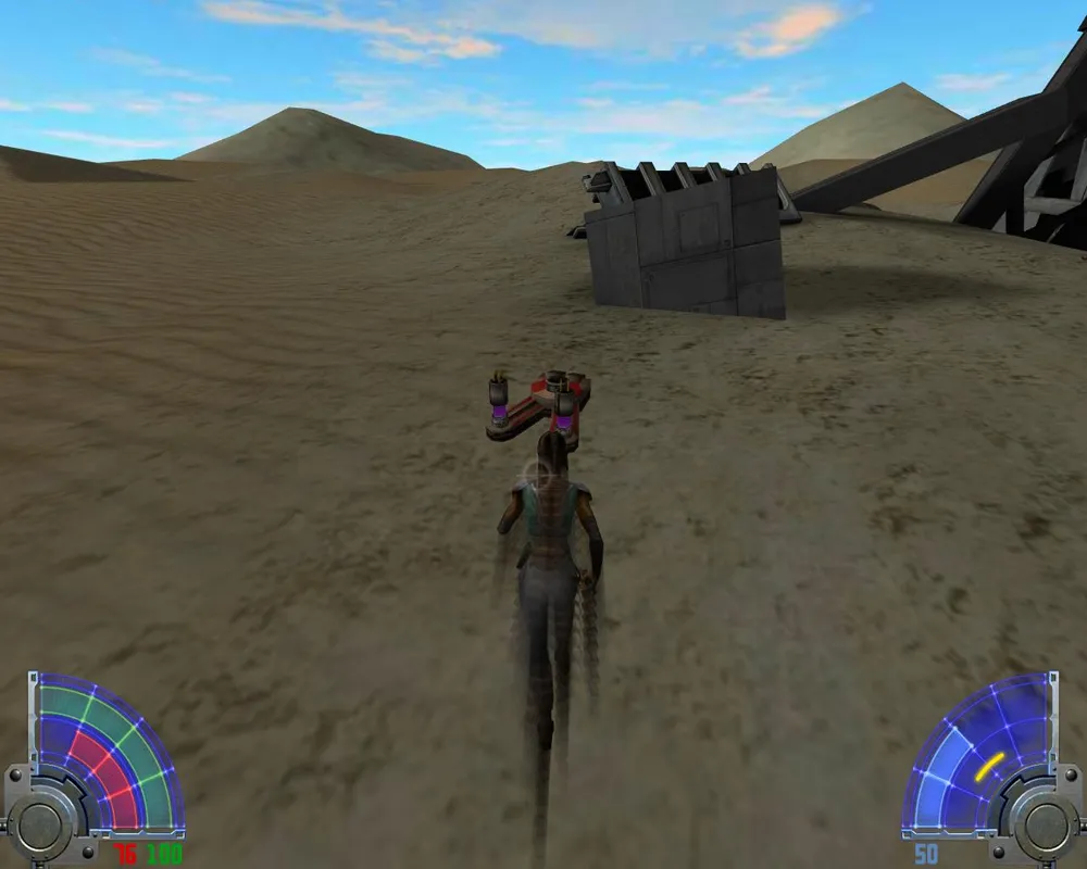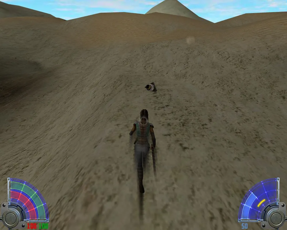 Находим рычаг, дергаем за него, и огонь гаснет навсегда. Заходим в лифт и спускаемся вниз. Мы попадаем в отсек, где находятся дроиды. Теперь там не только они, а еще и песчаные люди. Проблем с ними возникнуть не должно, однако нам потребуется два раза отодвинуть железные телеги.