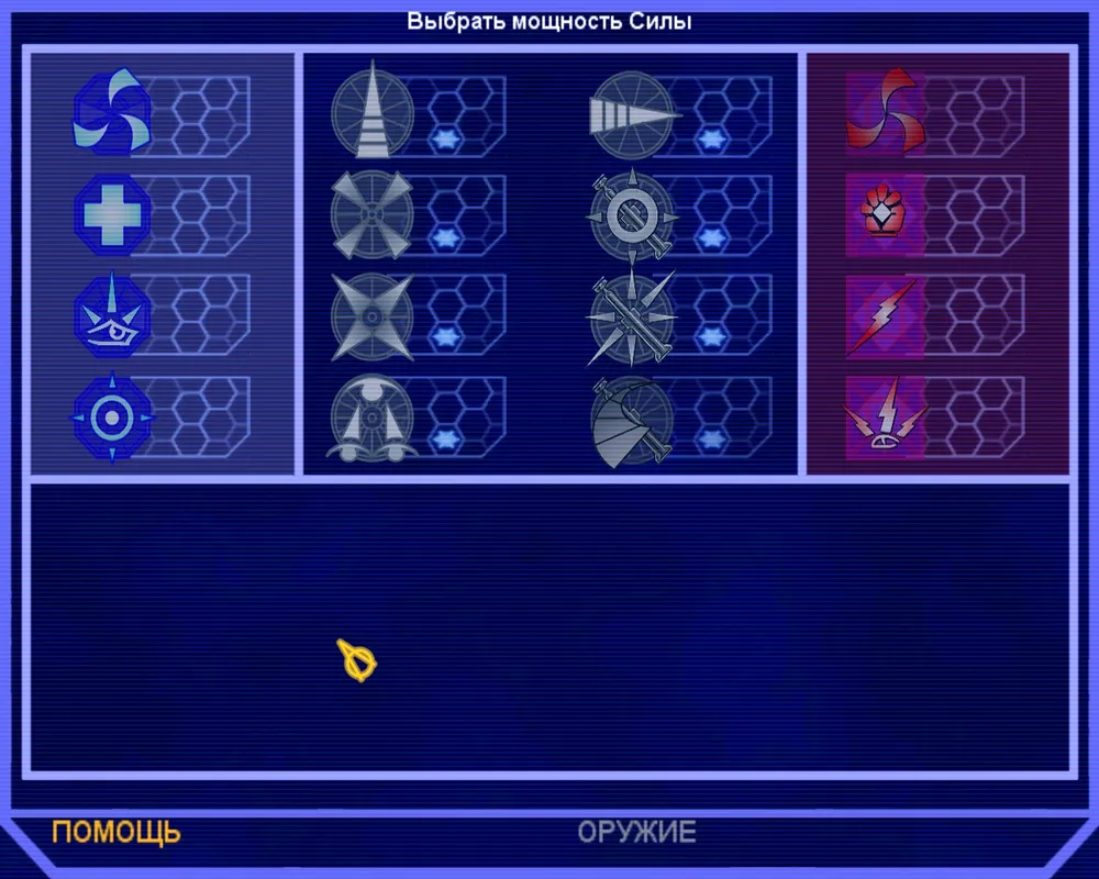 Перед началом каждой миссии мы можем прокачивать по одной из способностей темной или светлой стороны силы. То, что посередине, корневые способности, прокачать самим нельзя. Я предпочитаю сначала выучивать лечение светлой стороны.