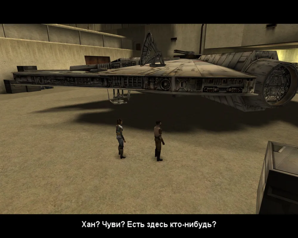 Убив его, и отключив удерживающий луч, спускаемся на лифте и ждем, когда Чубакка откроет для нас дверь. Последняя схватка с наемниками произойдет в ангаре "Тысячелетнего Сокола", и только после этого появляется Кайл.