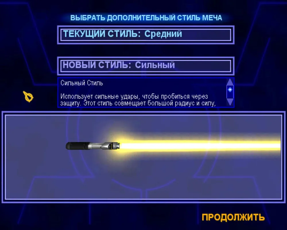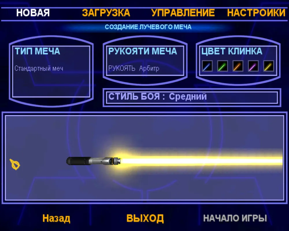 Так же нам необходимо выбрать меч для персонажа. Вначале нам доступен лишь одиночный меч со средним стилем, однако мы можем сменить рукоятку и цвет меча. Цветов всего 5 и среди них нет красного, потому что почти всю игру мы будем играть за светлого джедая.