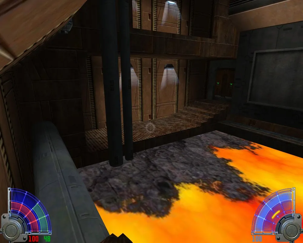 Поднимаемся и попадаем в помещение, в котором полно расплавленного металла. Если в него упасть - то быстро умираем, надо найти безопасный путь.