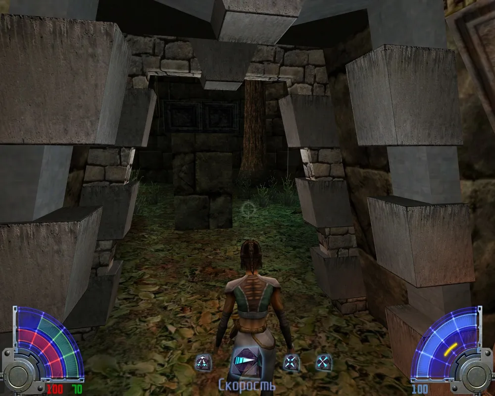 Пробежав по коридорам, один вид которых заставляет заблудиться, мы, наконец, попадаем на место последнего испытания. Используем способность силы «Скорость», чтобы успеть пробежать до того, как двери закроются. Лучше использовать ее в том месте, где показано на скриншоте, и потом побежать.