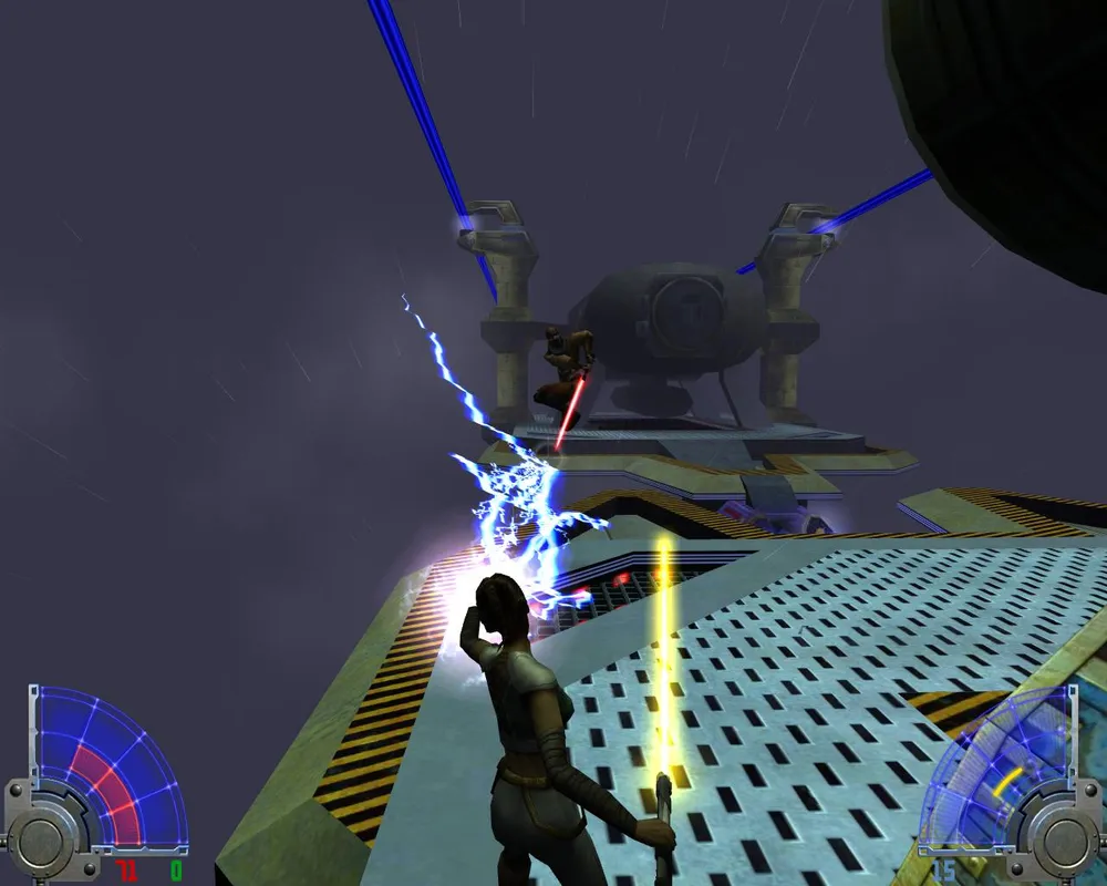 Попав наверх, сразу же отключаем луч, удерживающий "Тысячелетний Сокол". Идем в соседнее помещение, чтобы освободить "Коготь Ворона", но там нас уже ждет Темный Джедай.