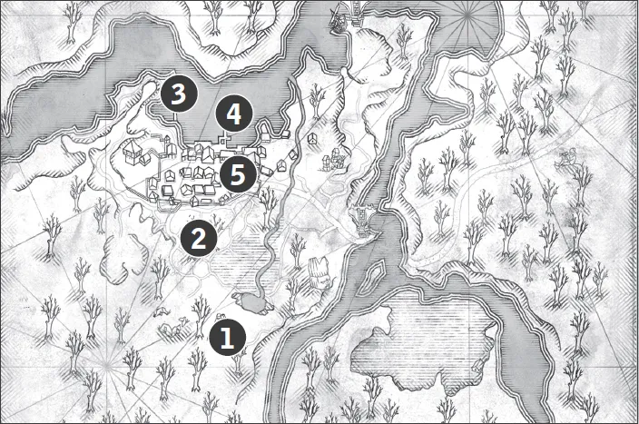 Итак, мы отправляемся к торговцу [3], чтобы обсудить награду за убийство монстра. Мы можем припугнуть его, использовать на нем Знак Аксий или же просто попросить поднять цену. Кроме того, мы можем потребовать аванс. Сам торговец мало что знает о монстре и советует обратиться к Седрику, местному зверолову. Его можно найти в Биндюге, деревушке под городскими стенами [4].