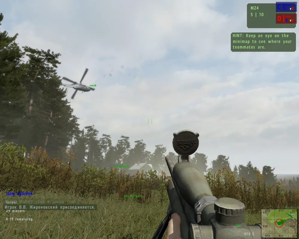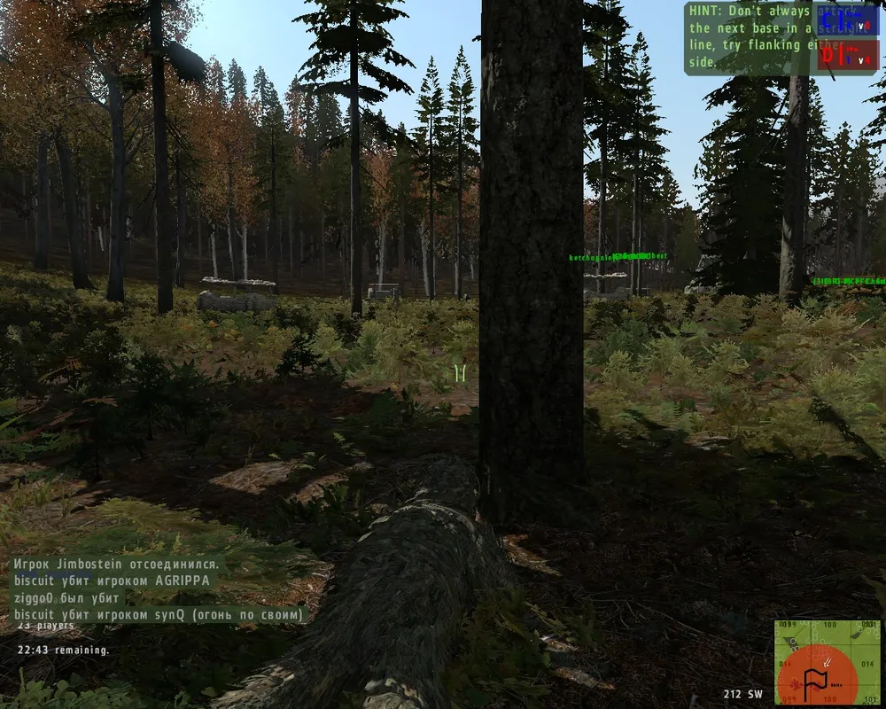 Можно забраться глубоко в лес, сесть на холмик, взять снайперскую винтовку и простреливать небольшую улочку. В траве ведь вас не заметишь, тут частенько даже своих снайперов убивают, поскольку определить кто свой, кто чужой крайне проблематично (если, конечно, не стоит в настройках более щадящий режим с именами над головами). И выбивать таких скрытных героев приходится авиацией. Кто-то из врагов в чате или голосом передает ваши примерные координаты и через двадцать секунд бомбардировщик сжигает все в отмеченном квадрате. Так что придется после каждого выстрела менять позиции, прятаться, ждать. И все эти мучения окупятся, если вы убьете хотя бы двух-трех противников. Добраться до поля боя здесь очень сложно и поэтому одним метким выстрелом вы выбиваете врага на несколько минут. Что уж говорить о чисто моральном эффекте от того, что где-то неподалеку орудует снайпер. Цена смерти высока, поэтому все натурально бояться и потому излишне осторожничают.