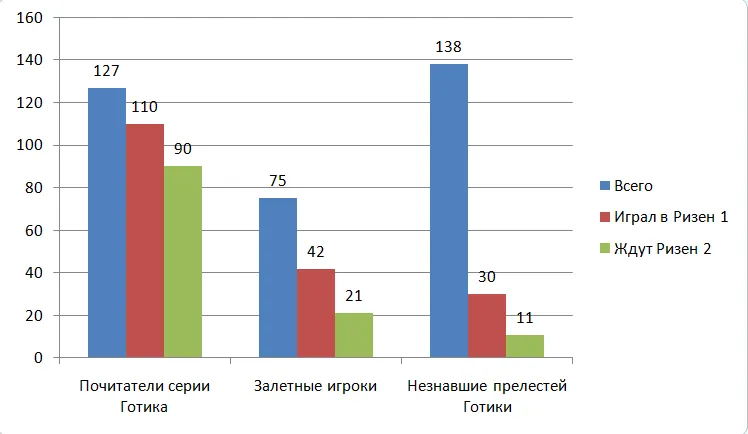 А вот опрошенные третьей группы (138 человек откликнувшихся на мой опрос), совершенно не стесняясь, отметили, что знать не знали, что такое Готика и «с чем иё идять». Лишь 21% из них опробовали первую Ризен, но 80% забросили игру не дойдя до финала, и только 30% из общего числа игравших ждут вторую часть.