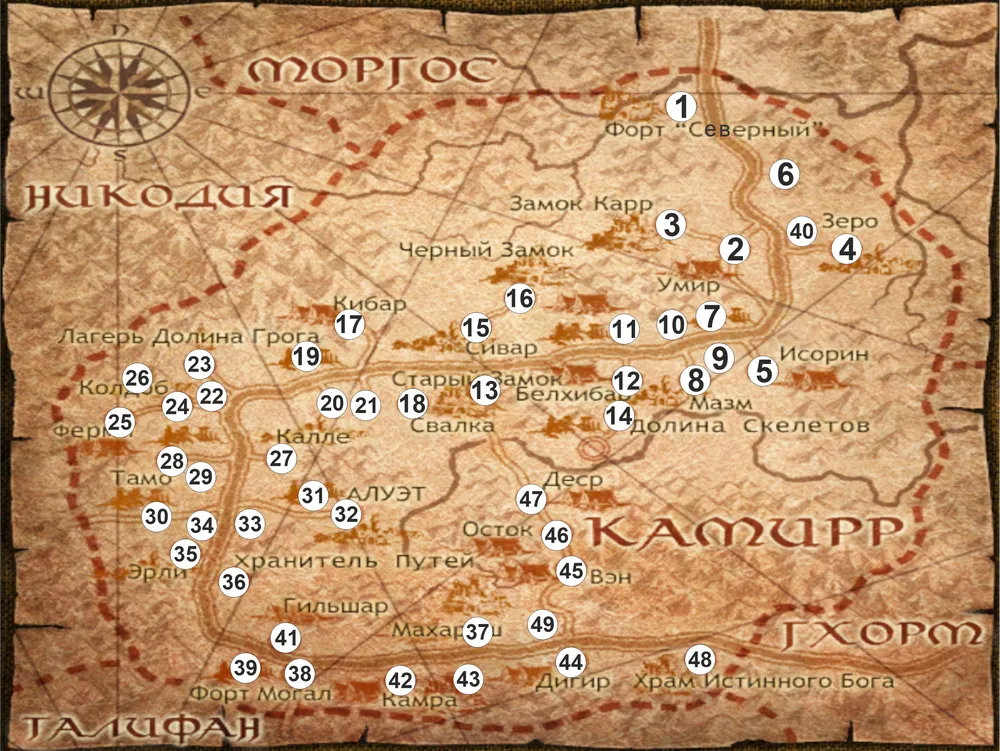 1 - форт Северный. 2 - деревня Умир. 3 - замок Карр. 4 - деревня Зеро. 5 - Исорин. 6 -заброшенная шахта. 7 - подземный город. 8 - Мазм. 9 - серебряный рудник. 10 - восточный вход в гробницу Изидора. 11 - западный вход в гробницу Изидора. 12 - Белхибар. 13 - Старый замок. 14 - Долина скелетов. 15 - Сивар. 16 - Черный замок. 17 - Кибар. 18 - свалка. 19 - подземелье личей. 20 - деревня Тихая гавань. 21 - вампирский замок. 22 - таверна "Голова ворна". 23 - лагерь Долина Грога. 24 - Колдоб. 25 - фермы. 26 - кладбище. 27 - Калле. 28 - Тамо. 29 - два склепа. 30 - запертая дорога в Никодию. 31 - кузница Торио. 32 - Алуэт. 33 - таверна "Черная рука". 34 - разрушенный форт. 35 - Эрли. 36 - Хранитель Путей. 37 - Махариш. 38 - форт Могал. 39 - руины Древних. 40 - развалины дома нотариуса. 41 - Гильшар. 42 - Камра. 43 - склад Иссира. 44 - фактория Дигир. 45 - деревня Вэн. 46 - Осток. 47 - Деср. 48 - храм Истинного бога. 49 - шахта.
