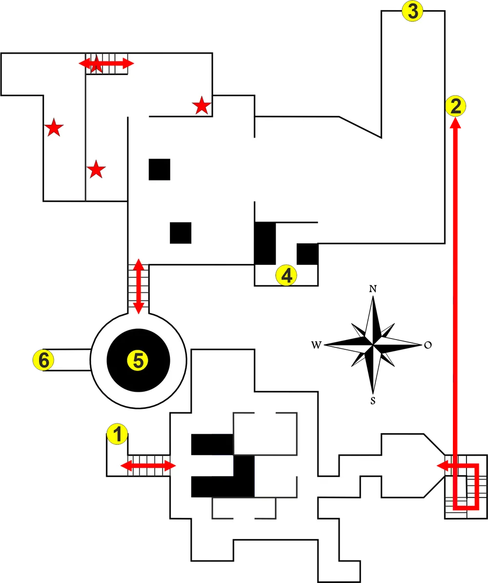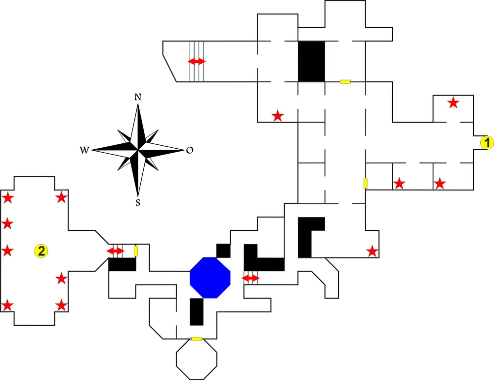 1 - выход из подземелья. 2 - сокровищница. Звездами показаны контейнеры. Красными линиями показаны лестницы (стрелки показывают направление перемещения по ним).