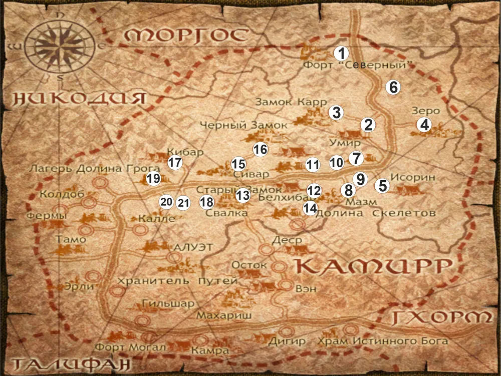1 - форт Северный. 2 - деревня Умир. 3 - замок Карр. 4 - деревня Зеро. 5 - Исорин. 6 -заброшенная шахта. 7 - подземный город. 8 - Мазм. 9 - серебряный рудник. 10 - восточный вход в гробницу Изидора. 11 - западный вход в гробницу Изидора. 12 - Белхибар. 13 - Старый замок. 14 - Долина скелетов. 15 - Сивар. 16 - Черный замок. 17 - Кибар. 18 - свалка. 19 - подземелье личей. 20 - деревня Тихая гавань. 21 - вампирский замок.