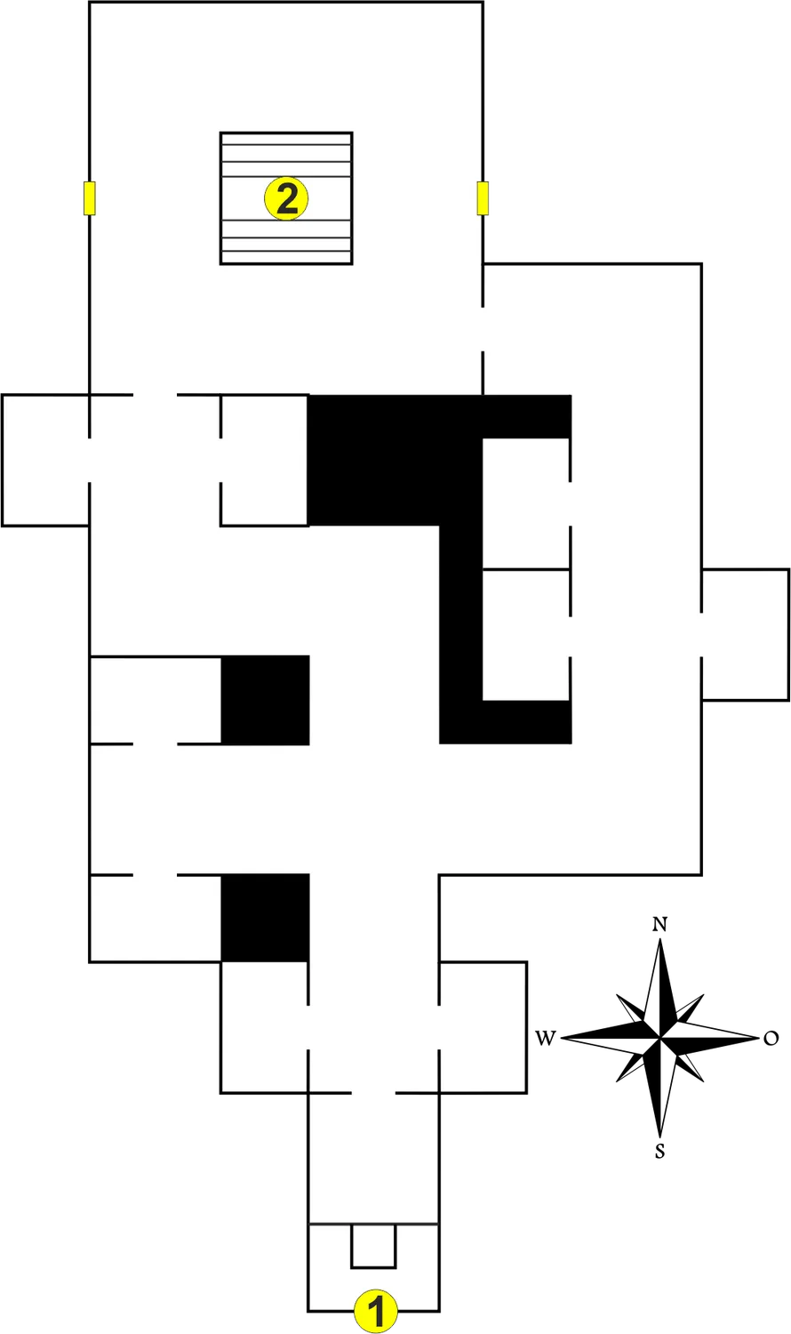 В отличие от южного склепа северный склеп весьма мал (см. рисунок выше) и населен личами. Очистив склеп от этой нежити, обыщите саркофаги, находящиеся в склепе. Вы найдете изумруды и деньги.