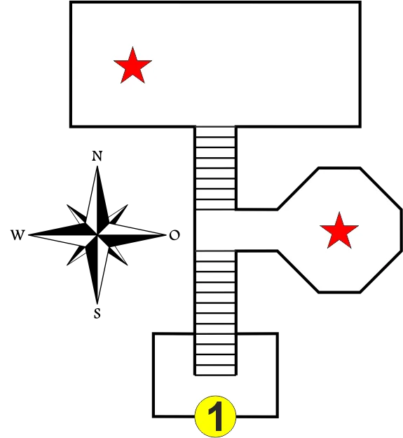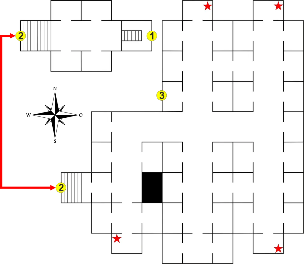1 - выход на поверхность. 2 - переход между верхним и нижним ярусами. 3 - щель в стене. Звездами показаны сундуки.