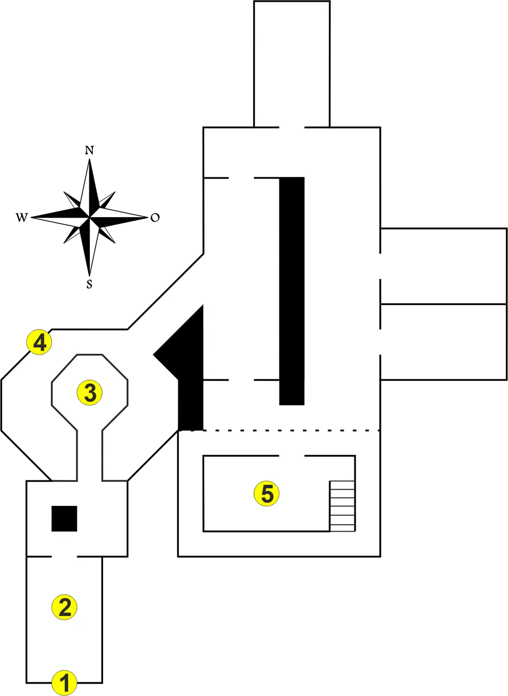 1 - главный выход из замка. 2 - холл. 3 - амфитеатр. 4 - переход между амфитеатром и западной частью замка. 5 - библиотека.