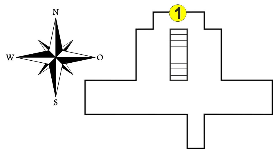 1 - выход из склепа. Звездами показаны контейнеры с трофеями.