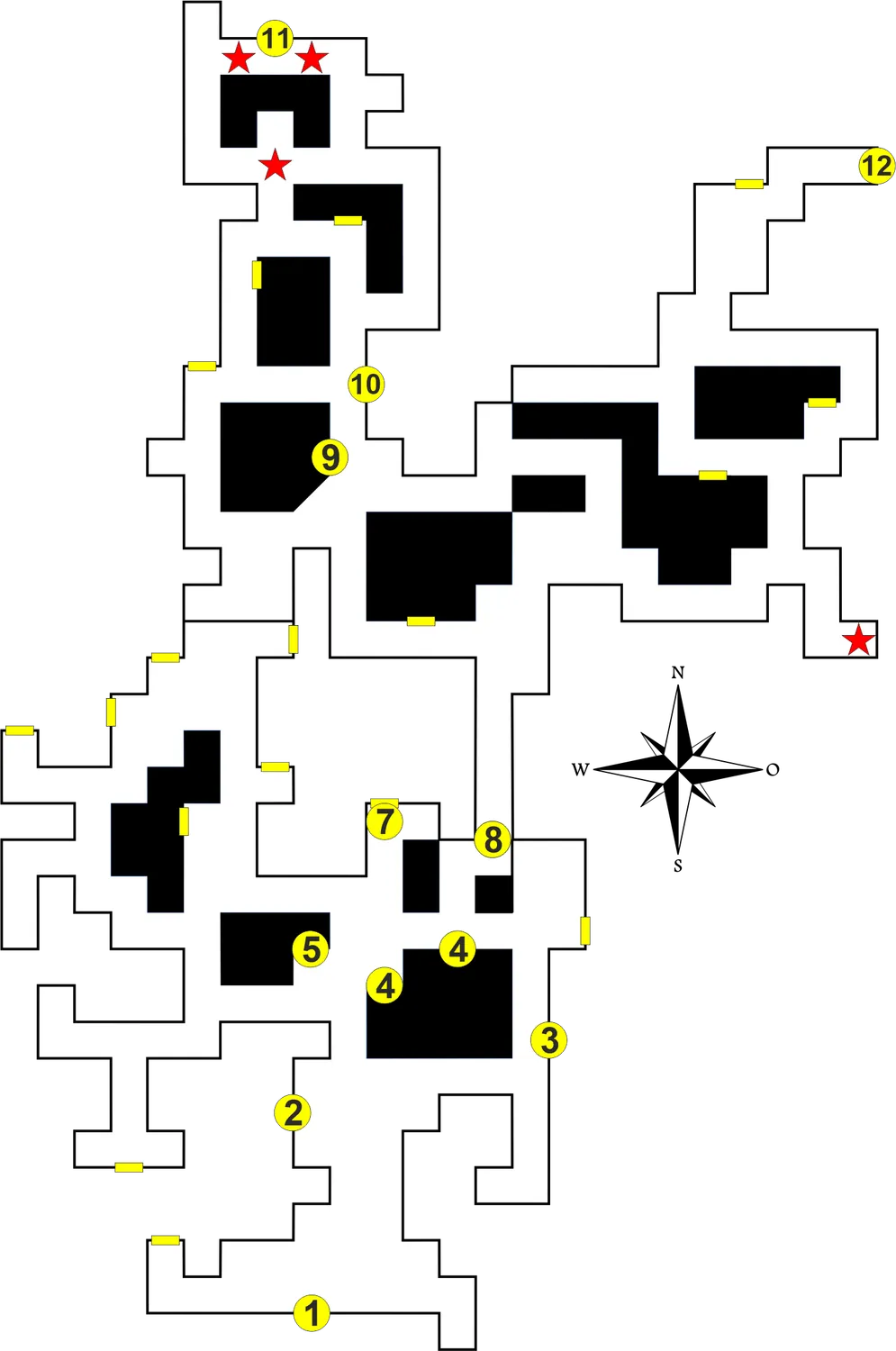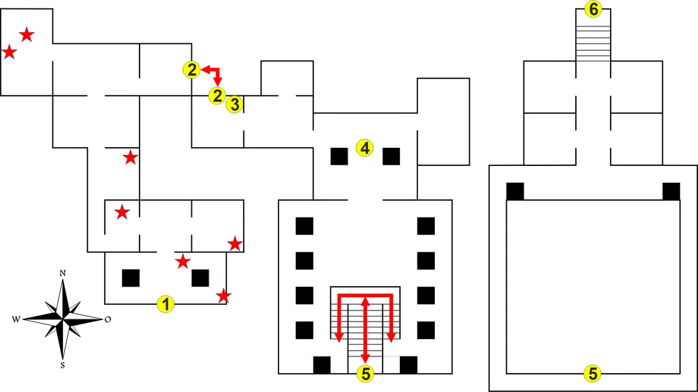 1 - выход из склепа. 2 - трещина в стене. 3 - Корнелиус. 4 - лаборатория некромантов. 5 - переход между первым и вторым ярусами. 6 - северный выход. Звездами показаны трофеи.