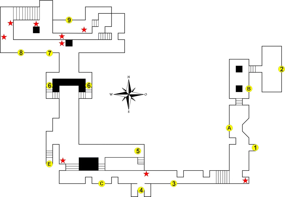 1 - выход из города. 2 - магическая лавка. 3 - жилье Шаргу. 4 - постоялый двор "Ледяное спокойствие". 5 - кузнец. 6 - переход между нижней и верхней террасами. 7 - жилье с камерой. 8 - запертая дверь. 9 - вход в замок некромантов. A, B, C, E - склепы. Звездами показаны трофеи.