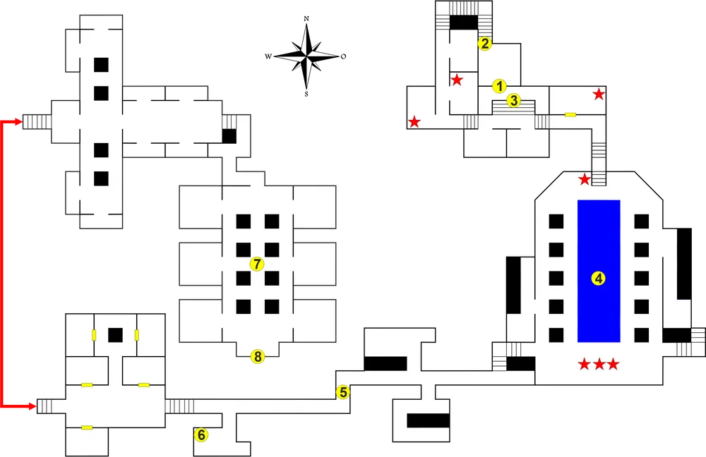 1 - выход из южного склепа. 2 - щель в завале. 3 - спуск в пустой зал. 4 - ритуальный зал. 5 - переход между склепами. 6 - разбойник. 7 - склеп D. 8 - выход из склепа D. Звездами показаны контейнеры.