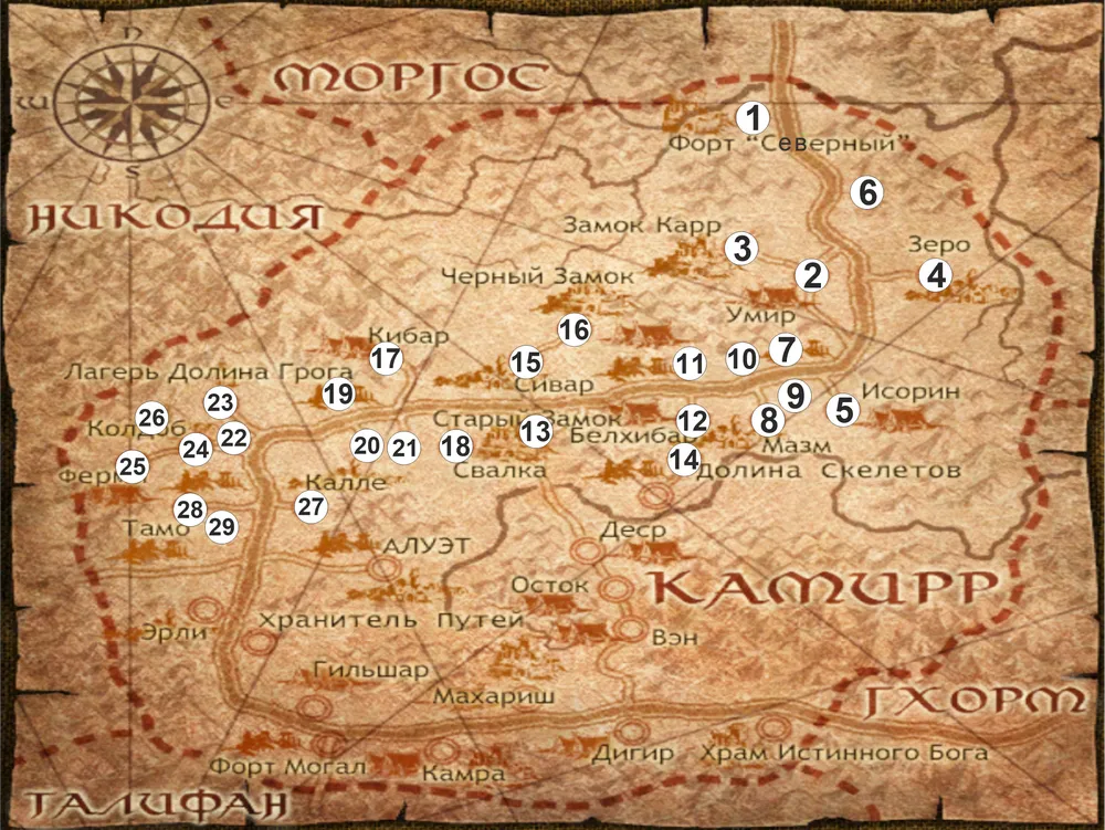 1 - форт Северный. 2 - деревня Умир. 3 - замок Карр. 4 - деревня Зеро. 5 - Исорин. 6 -заброшенная шахта. 7 - подземный город. 8 - Мазм. 9 - серебряный рудник. 10 - восточный вход в гробницу Изидора. 11 - западный вход в гробницу Изидора. 12 - Белхибар. 13 - Старый замок. 14 - Долина скелетов. 15 - Сивар. 16 - Черный замок. 17 - Кибар. 18 - свалка. 19 - подземелье личей. 20 - деревня Тихая гавань. 21 - вампирский замок. 22 - таверна "Голова ворна". 23 - лагерь Долина Грога. 24 - Колдоб. 25 - фермы. 26 - кладбище. 27 - Калле. 28 - Тамо. 29 - два склепа.